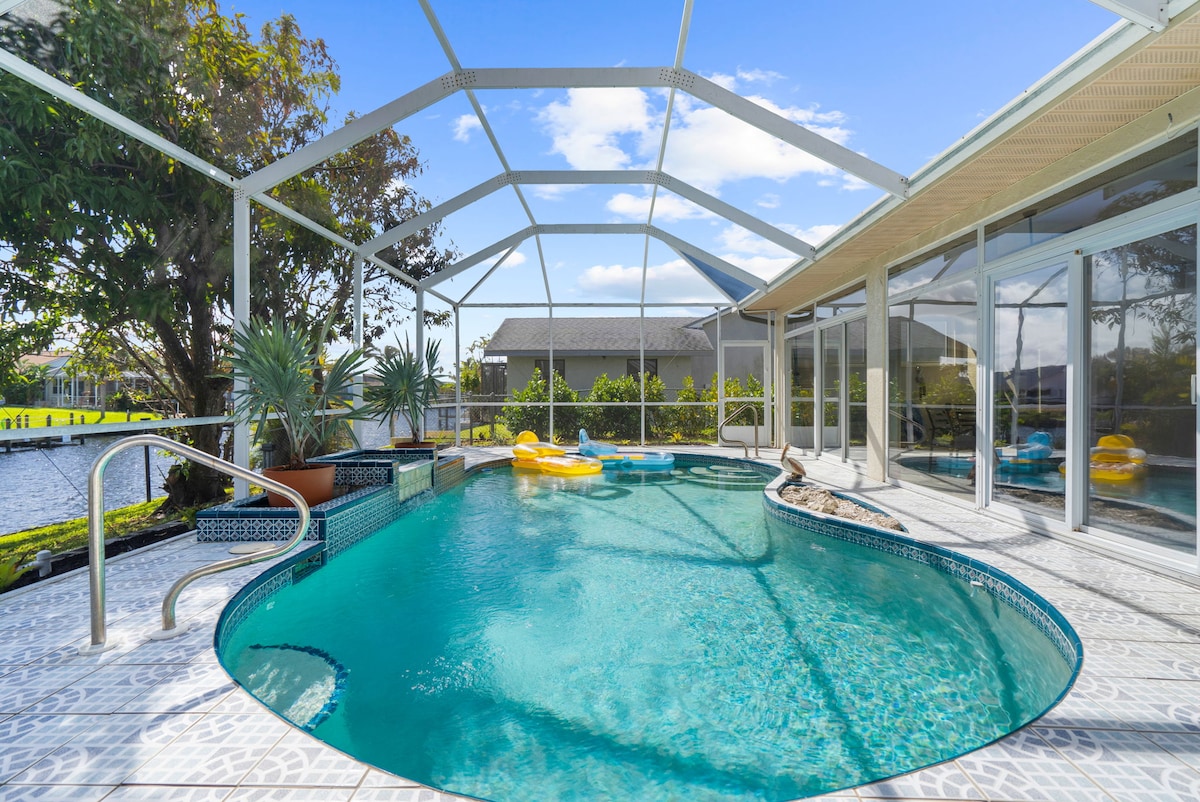 Dieses spektakuläre 2358 Quadratfuß Cape Coral-Haus am Wasser wird deine Erwartungen mit seinen luxuriösen Updates und reichlich Annehmlichkeiten übertreffen. In einer ruhigen Gegend gelegen, aber nur wenige Minuten von Einkaufsmöglichkeiten, Lebensmittelgeschäften, Restaurants und Stränden entfernt! Genieße eine große Veranda mit einem beheizten Pool und Spa, einem Außenfernseher und einem eingebauten Grill. Inklusive Kajaks, Angelruten, Strandartikeln, Kinderwagen, privatem Parkplatz in der Einfahrt, WLAN und Drucker. Zugang zum Golf mit Bootsanlegestelle.