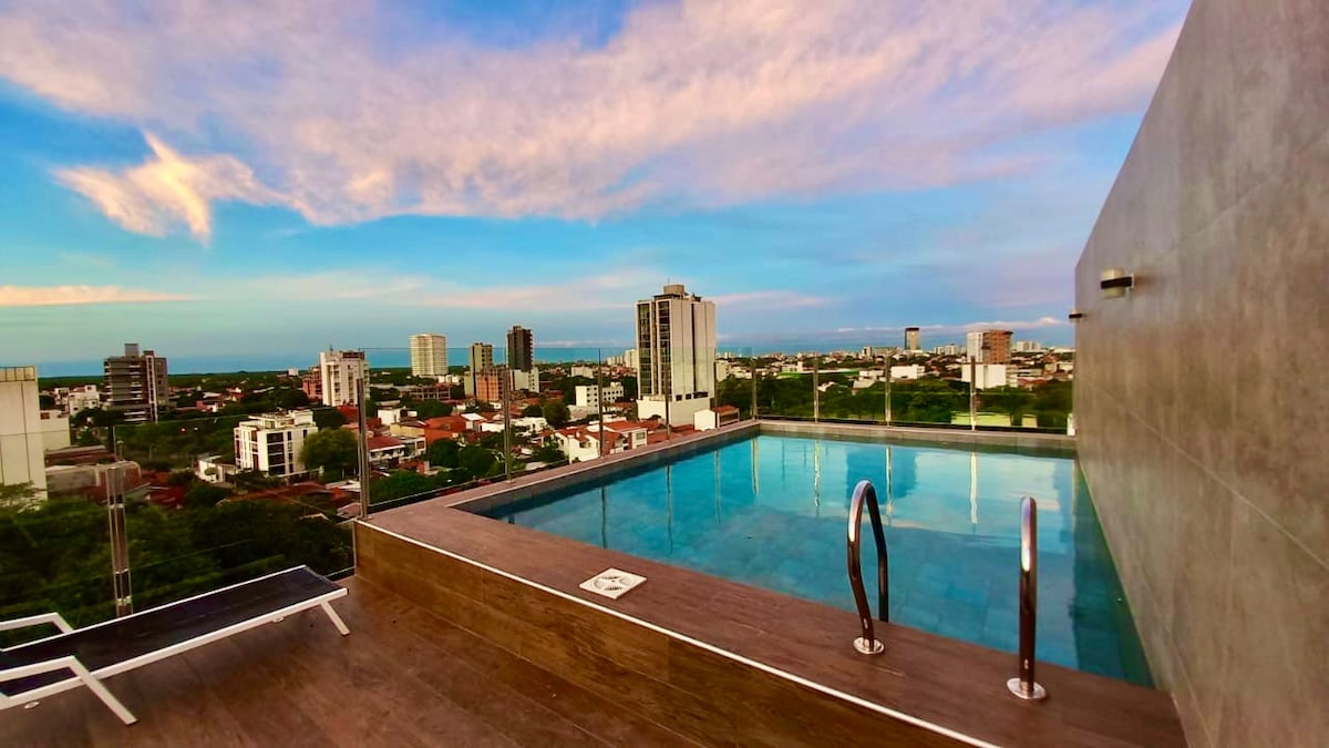 Genieße deinen Aufenthalt im höchsten Airbnb in Santa Cruz und im besten Gebäude der Stadt. In den Einrichtungen kannst du Piscina, Sauna a Vapor, spektakuläre Ausblicke von der 26. Etage auf das wunderschöne Manzana 40-Gebäude, die Natur der ökologischen Absperrung und den Urubo genießen. Ein paar Schritte vom Supermarkt, Restaurants, Einkaufszentrum, Geschäftszentrum, Banken, Spa. Im Gebäude befinden sich die höchsten und schönsten Restaurants in Santa Cruz, die Cielo Skay Bar und Jardin in Asia.