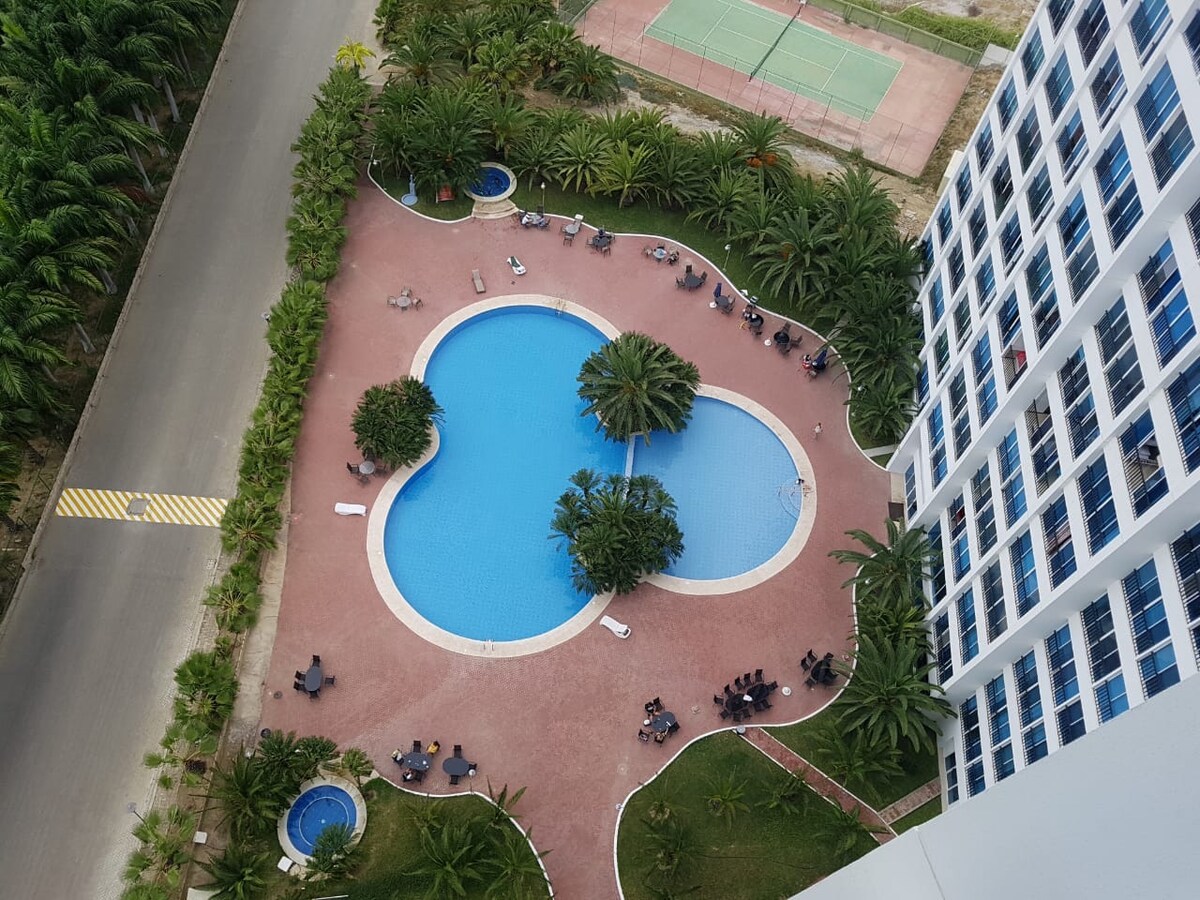 Frisch renoviert, voll ausgestattet und möbliert, mit verschiedenen Elektrogeräten, Smart-TV, Klimaanlagen, warmem Wasser und dem Nötigsten für Ihren Aufenthalt. Kinderbett und Hochstuhl für kleine Kinder. Wifi im Apartment und in der Lobby. Kinderbecken ist beheizt. Im Erdgeschoss gibt es Spieltische, ein Dampfbad und eine Waschküche. Eine Terrasse, die reserviert werden kann. 1 Parkplatz ist inbegriffen. Ruhige Lage. Man hört das Meeresrauschen. Wenige Minuten entfernt ist eine Mall mit Kino.