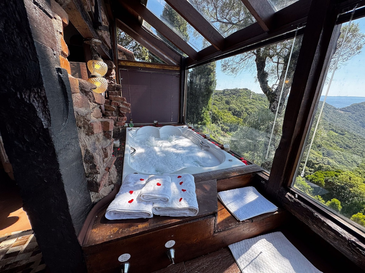 A Cabana Buena Vista hospeda confortavelmente 2 adultos, dispõe de uma confortável cama de luxo, banheira de hidromassagem com vista para o por do sol, ar condicionado, lareira interna, fogo de chão, balanço externo, cozinha equipada, frigobar e para uma experiência intimista dispõe de utensílios para sequência de fondue.