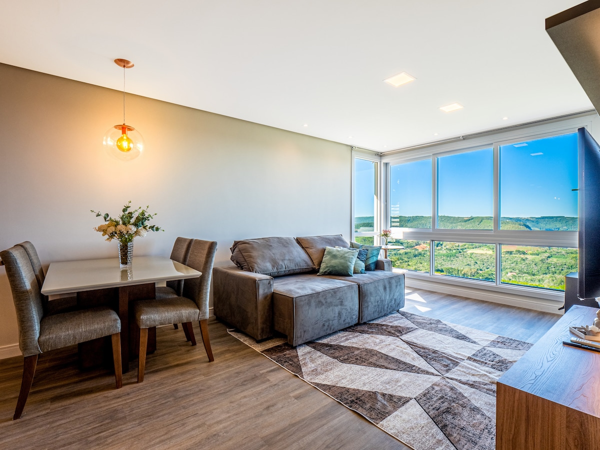 *Für Weihnachten/Neujahr mindestens 4 Übernachtungen* Neue Wohnung. 2 Schlafzimmer/5 Personen. Suite+Gästebad. Fein eingerichtet. Hoher Ort, schneebedeckt. 800 Meter von Snowland. 8 km/10 Minuten vom Zentrum entfernt. Ideal, um Gramado zu erkunden und sich auszuruhen. Umgeben von Natur. Schöne Aussicht vom Wohnzimmer. Blick auf das Tal. Aufzug, WLAN, Garage für 2 Autos, Fernseher, voll ausgestattete Küche. Warmwasser. Grill, Waschmaschine/Trockner. Warme/kalte Luft in allen Räumen. Deck im Gemeinschaftsbereich.
