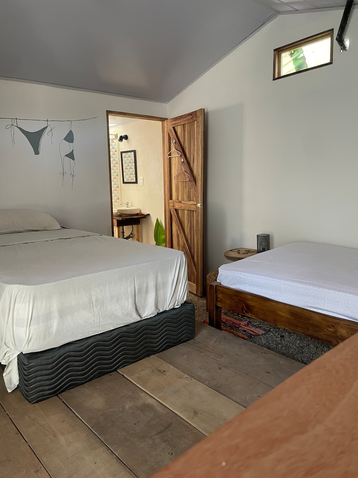 Santa Teresa North an der Hauptstraße, 2 Minuten zum Meer Stil der Unterkunft / Parkplatz / Haustierfreundlich Das Surf Cottage Studio ist mit einem bioklimatischen nachhaltigen Ansatz ausgestattet und verfügt über einen Dachboden mit zwei Geschäften, einer ausgestatteten Küche, einem eigenen Bad, WLAN, einem Queensize-Bett im Erdgeschoss und zwei Einzelbetten im Obergeschoss. Umgeben von einem Bio-Garten ist es eine Art von Glamping-Erfahrung, keine gute Übereinstimmung für Hotelreisende. Bitte lies die vollständige Beschreibung durch.