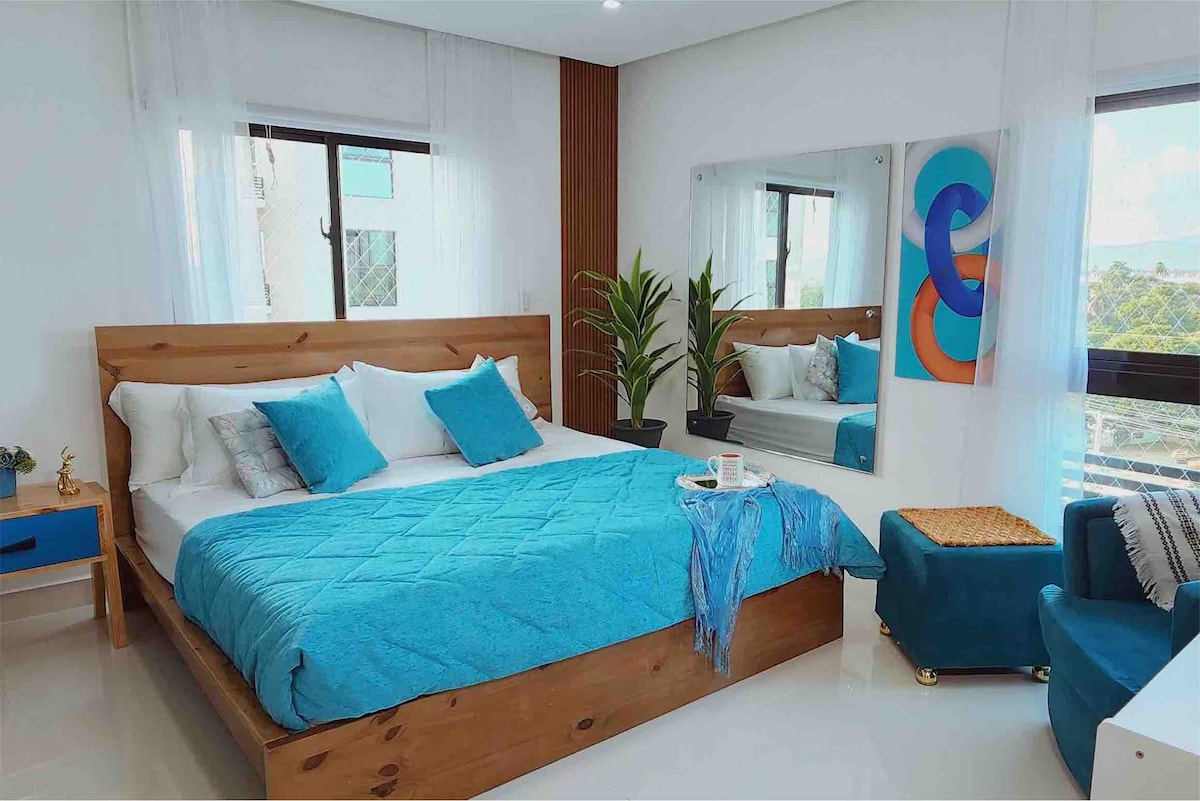 Luxury modern apartment with pool and mountain views, minutes from Cibao Airport. Features king & queen beds, fast Wi-Fi, smart TV, full kitchen and free gated parking. Perfect for families, couples and business travelers seeking comfort and style. ✔ Spacious living room with stylish décor ✔ King bed + Queen bed with premium mattresses ✔ Fully equipped kitchen ✔ Fast Wi-Fi and Smart TV ✔ Free gated parking ✔ Pool access — one of the few in the area