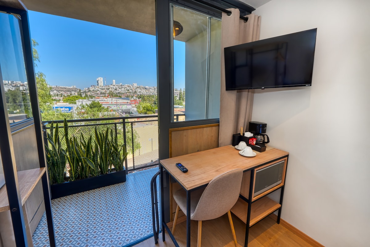 Vive la experiencia de hospedarte en un lugar rodeado de arte, comodidad y tranquilidad; gozando de las amenidades que ofrecemos como lo son: Coworking, sala de juntas, bar y gym calistenia. Contamos con una ubicación privilegiada a 3 minutos de los Arcos, la cual cuenta con: supermercado, bancos, restaurantes, cafeterías y bares. Contamos con estacionamiento dentro de las instalaciones.