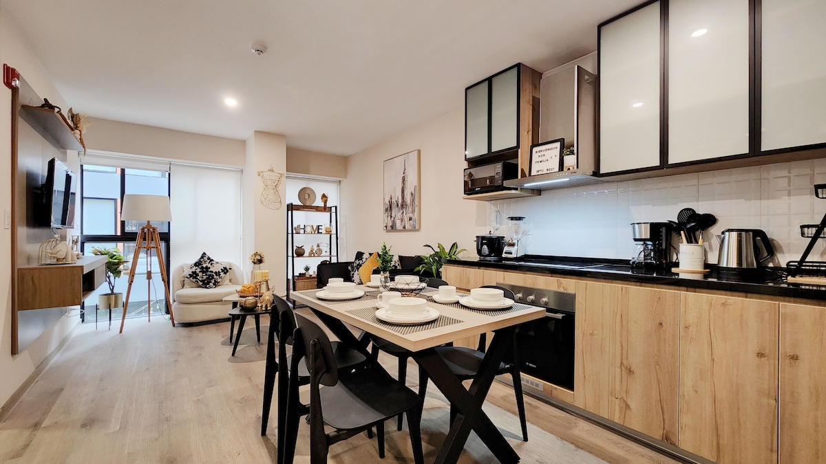 Moderno departamento que combina diseño contemporáneo y comodidad. Cuenta con una sala luminosa conectada a una terraza privada con sillas modernas y plantas, ideal para relajarse. La cocina equipada incluye electrodomésticos modernos y un comedor con mesa de mármol. El dormitorio principal tiene cama queen, un clóset amplio y TV. Además, ofrece Wi-Fi ,acceso a la piscina del edificio y lavaseca , perfecto para estancias largas o cortas. *preguntar por disponibilidad de estacionamiento