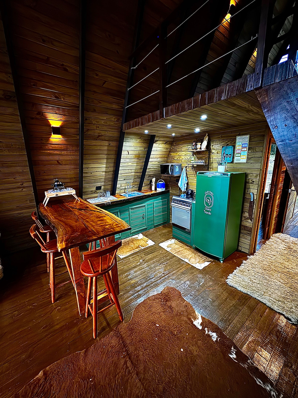 O chalé, construído dentro de uma antiga estufa de secar fumo, oferece uma experiência única em meio à natureza. Com design rústico e aconchegante, o ambiente preserva o charme histórico do local. A área externa proporciona uma vista deslumbrante do lago que fica à frente, criando um refúgio tranquilo e perfeito para seu momento em família. Fique à vontade para caminhar em meio às araucárias e plantações de erva-mate.