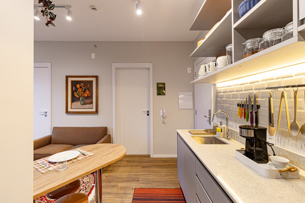 Studio von 26m² mit Dekoration von einem Architekten im Herzen von Jardins. Gemütliche und ideale Atmosphäre für Alleinreisende, Freunde, Paare und Familien mit Kindern! Wir beherbergen bis zu 4 Gäste mit Komfort und Vielseitigkeit Wir befinden uns 3 Minuten von der berühmten R. Oscar Freire: sicher, voll von Restaurants, Geschäften, Apotheken und Märkten In einer zentralen Region, ideal für diejenigen, die auch wichtige Punkte der Stadt wie den Ibirapuera Park, die Avenida Faria Lima und andere erkunden möchten
