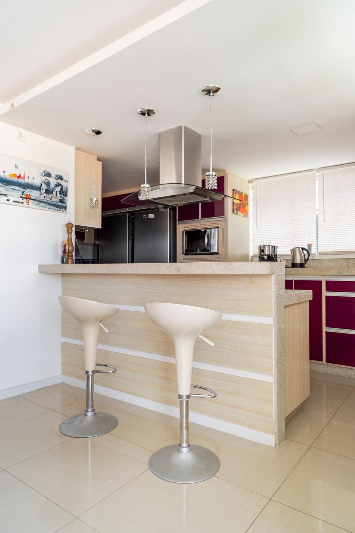 🏖️Gemütlich, gut gelegen und angenehm Voll ausgestattete✅ Küche. ✅1 Schlafzimmer mit 01 Einzelbett, Einbauschrank, Balkon mit Meerblick. Nebenan das Gemeinschaftsbad. ✅1 Schlafzimmer (Suite) mit 01 Doppelbett, Kleiderschrank, Schreibtisch, 02 Matratzen auf dem Boden, Balkon und exklusivem Badezimmer. ✅Ein Wohnzimmer mit Doppelschlafsofa und Fernseher. ✅Esszimmer mit Tisch, 6 Stühlen, ✅Balkon mit Meerblick. ✅schöne Gourmet-Gegend mit Pool und Grill. Nummerierte überdachte✅ Garage/Gebäude