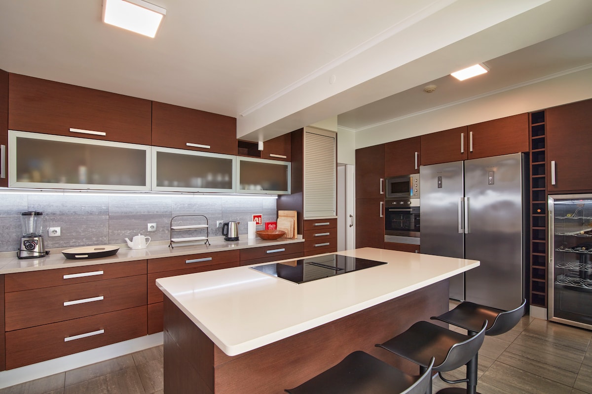 Elegantes, geräumiges Haus auf zwei Ebenen mit herrlichem Blick auf das Meer und die Berge. Genieße das Essen im Freien auf zwei Terrassen mit Blick auf das Meer und die Promenade. Günstig gelegen, ist das Haus einen kurzen 3-minütigen Spaziergang zum Strand, eine 5-minütige Fahrt oder 30 Gehminuten vom Zentrum von Ponta Delgada entfernt. In der Nähe befinden sich Lebensmittelgeschäfte, Cafés und Restaurants. Die Küche ist gut mit Geschirrspüler, Waschmaschine und Holzkohlegrill ausgestattet. Diese geräumige Unterkunft bietet Platz für bis zu elf Schlaf. Genieße kostenlosen WLAN-Zugang.