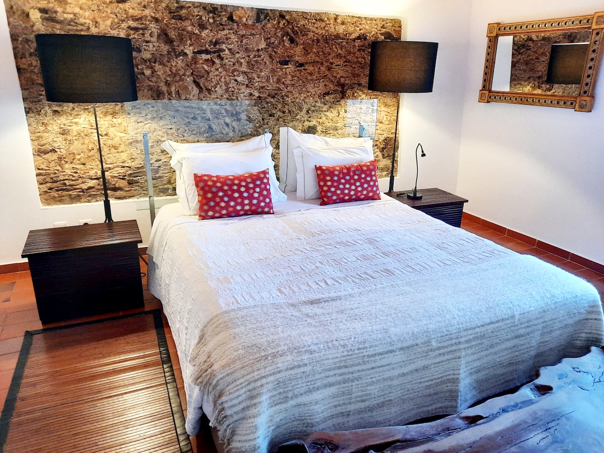 [BITTE LESEN: Für lichtempfindliche Menschen, bitte beachten Sie, dass die Vorhänge das Licht nicht vollständig abdunkeln.] Gemütliches, rustikal-modernes Studio im offenen Raum in der Altstadt von Aljezur, ganz in der Nähe der Burg. Es verfügt über einen Schlafbereich mit einem großen Bett und einem Kleiderschrank, ein Badezimmer, einen gemütlichen Wohn-Essbereich und eine Küche, die mit allen Grundlagen ausgestattet ist, die du für den täglichen Komfort benötigst. Kein Geschirrspüler und keine Waschmaschine. Es verfügt über eine private Terrasse mit Blick auf die Burg und die Stadt.