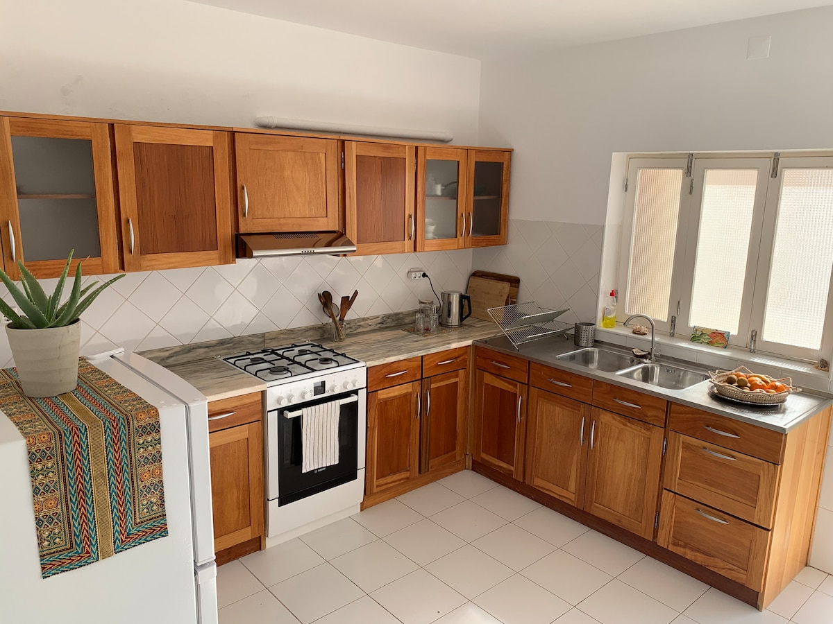 Deine Familie oder eine Gruppe von Freunden werden diese Villa sehr gut lieben, in der Nähe von allem. Mit Blick auf die Bucht von Mindelo, 2 Minuten von Praça Nova (Stadtzentrum), 5 Minuten zu Fuß vom Strand Laginha, 1 Minuten von der Marginal Avenue entfernt. Geräumiges, luftiges Gehäuse mit Außen- und Innenbereich, in dem natürliches Licht vorherrscht. 2 der Zimmer haben Balkone. Außenterrasse mit Baum und einer Hängematte. Es gibt einen Hinterhof. Anwesenheit eines brasilianischen Schlangenhundes zum Hausschutz.
