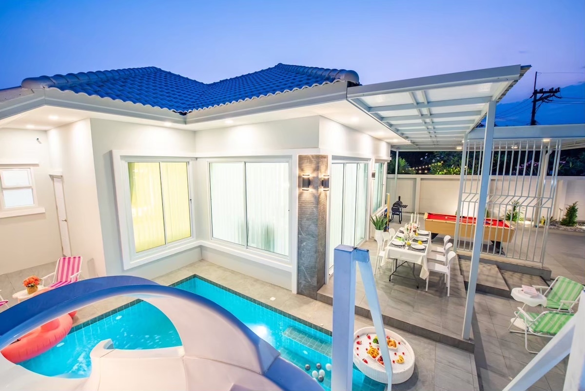 Peaceful 3-bedroom villa near Phoenix Golf and Jomtien Beach, ideal for families and couples. Enjoy your private jacuzzi, BBQ area, full kitchen, dining space, fast Wi-Fi, pool table, and swimming pool. Located in a quiet gated area with parking. Weekly/monthly discounts available. Additional services include airport transfers, local shopping mall and beach drop-offs. We advise you have a car or motorbike.