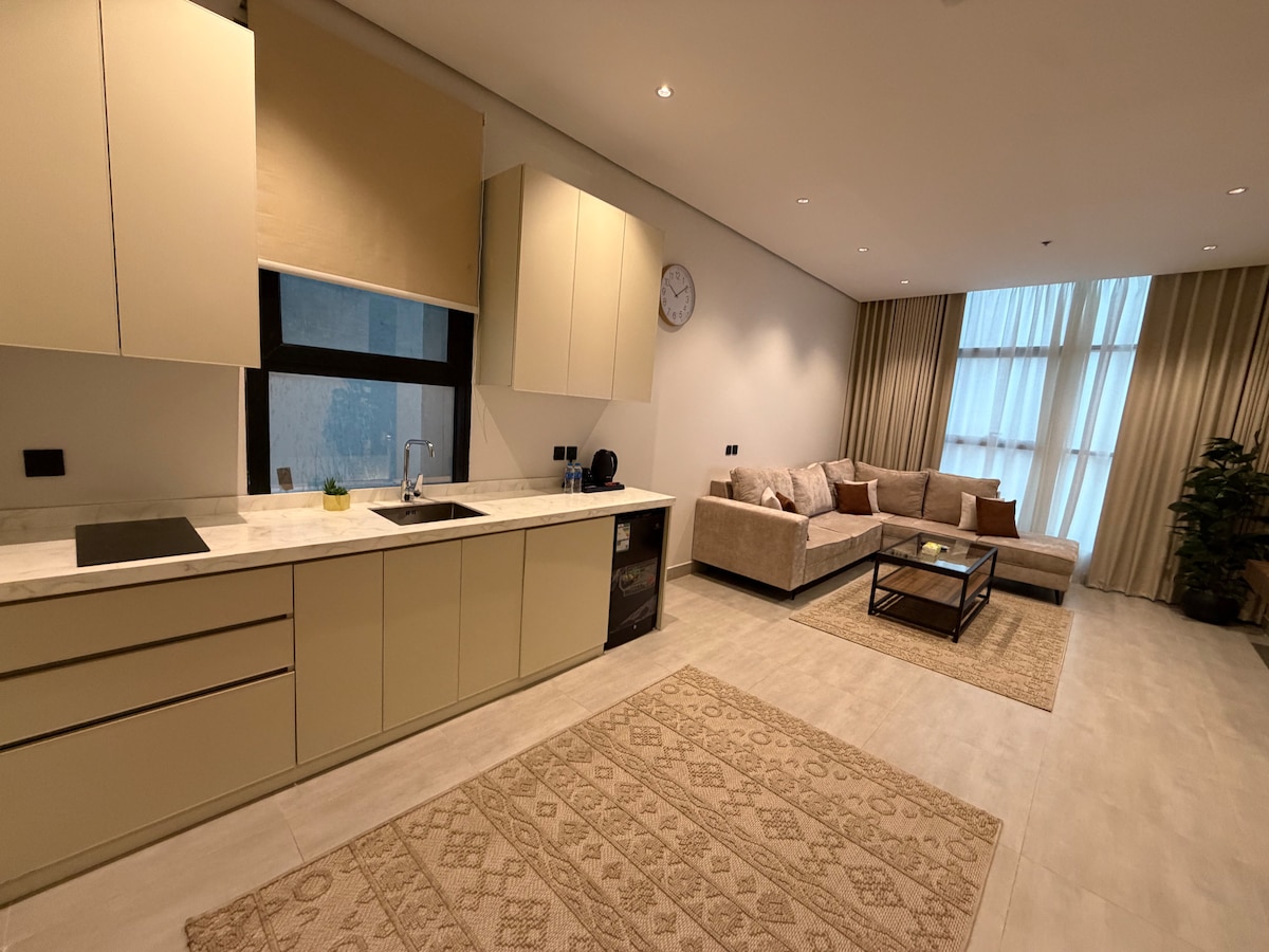 **Ausgezeichnete Lage 📍** Die Wohnung befindet sich in einer luxuriösen Wohnanlage, In der Nähe eines Supermarktes, einer Wäscherei und eines Sportwegs. Nur 5 Minuten von der Bahrain-Brücke entfernt🇧🇭. **Komfortables und modernes Studio-Apartment mit intelligentem Zugangssystem (Self Check-in) 🔑** **Merkmale:** - Neu mit klassischen Möbeln eingerichtet. - Mit Internetanschluss🛜 ⚡. - Verfügt über eine integrierte Serviceecke (Kühlschrank, Herd, Mikrowelle, Wasserkocher und Espressomaschine)☕️. - **Einrichtungen:** - Enthält Grünflächen, Schwimmbad (Schwimmzeiten: 9:00 bis 18:00 Uhr)🌞. Genießen Sie einen komfortablen und besonderen Aufenthalt!