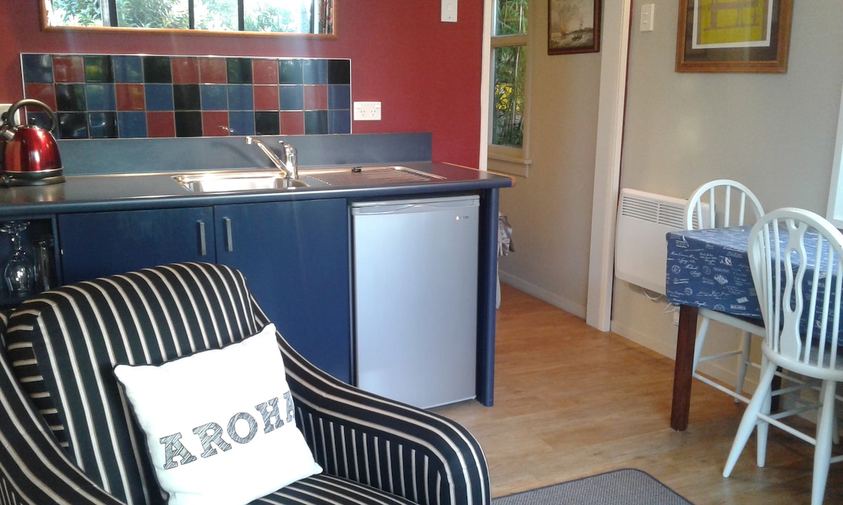 Set in a private courtyard garden below our own home, you have a warm , compact modern cottage , tiny, but designed for comfort. There are two rooms ; the living area with mini kitchen , and the bedroom with an en suite shower . From the living space and private deck you have views of the sea through the bush garden. Broad Bay on the Otago Peninsula is an ideal base for exploring the local attractions such as Larnach Castle, Albatross Centre and wildlife on the beautiful nearby beaches. .
