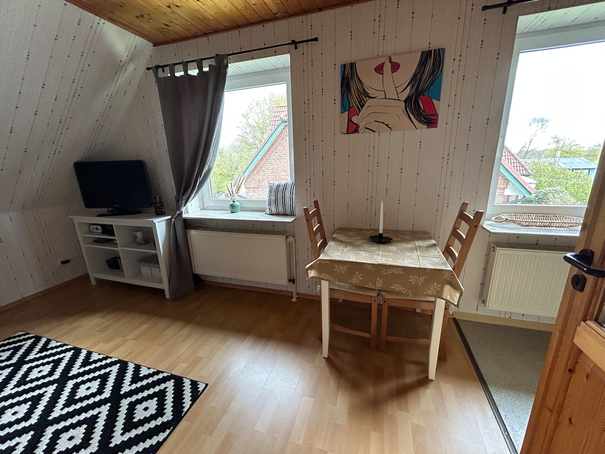 Die Wohnung lädt auch bei typisch Norddeutschem (Schmuddel-) Wetter zum Verweilen ein. Sie wurde 2025 energetisch saniert und verfügt über ein nachhaltiges Heiz- und Stromkonzept. Die Wohnung mit 2 Schlafzimmern und einem großzügigen Wohn- Essbereich befindet sich im 1. Obergeschoss, bietet ausreichend Platz für 4 Personen. Sie befindet sich in einer sehr ländlichen Umgebung, die zum Genießen und Spazierengehen einlädt und ist doch sehr zentral gelegen.
