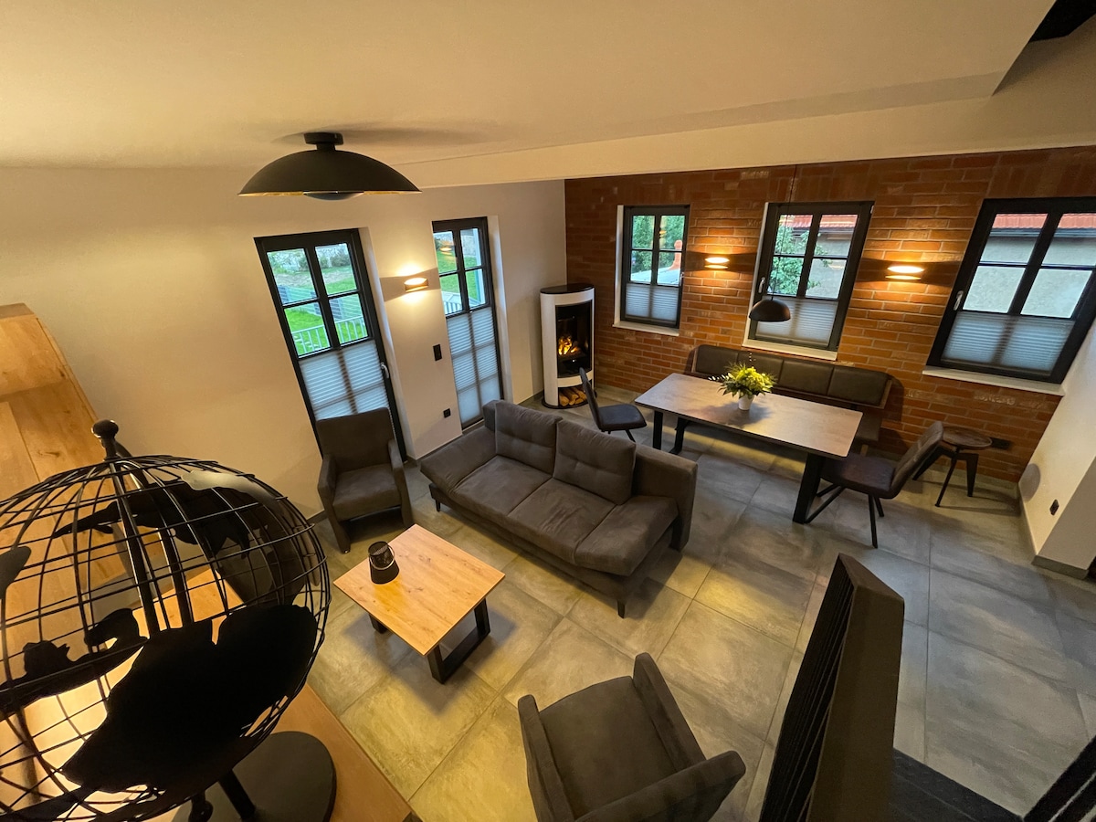 Entspanne dich im stilvollen und ruhigen Haus am Waldrand im UNESCO Biosphären Reservat, unweit des Rennsteiges (2 km entfernt). Haus ist modern und komplett eingerichtet mit Wohnzimmer inklusive Kamin, Sofa, Tisch, TV. Wohnküche mit Induktionsherd, Geschirrspüler und Waschmaschine befindet sich ebenerdig. Außerdem lohnt es sich, bei schönem Wetter auf der Terrasse mit herrlichem Weitblick zu frühstücken/grillen. Schlafraum (1,60 m Bett), Sofa sowie Arbeitsplatz (schnelles WLAN) und Ausblick.