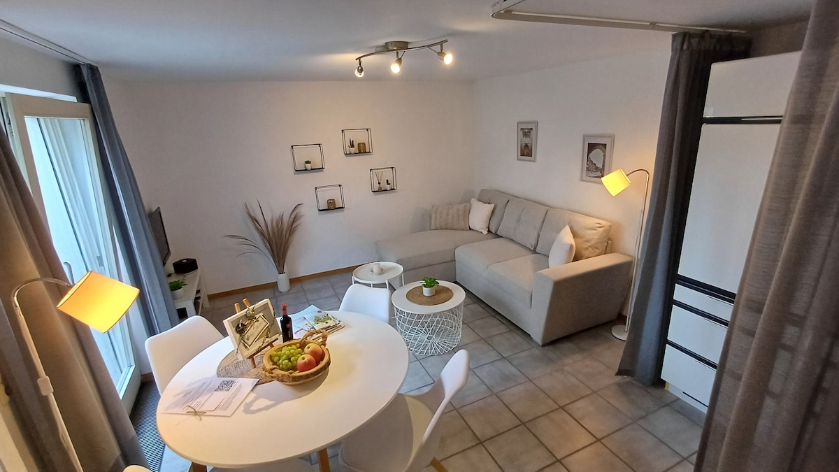 Die Wohnung war früher Teil unseres Einfamilienhauses und ist nun durch eine einfache Falttür von den hinteren Kellerräumen abgetrennt. Sie ist ideal für 2 Personen geeignet. Bei Bedarf können im Wohnzimmer 2 weitere Schlafplätze (Auszieh-Doppelbett) angeboten werden. Das Badezimmer ist über das Schlafzimmer zugängig. Die Kochnische im Wohnzimmer enthält einen 2-Plattenherd, Mikrowelle, Kaffeemaschine, Wasserkocher, Toaster und Kühlschrank. Die Terrasse ist mit Gartenmöbeln ausgestattet.