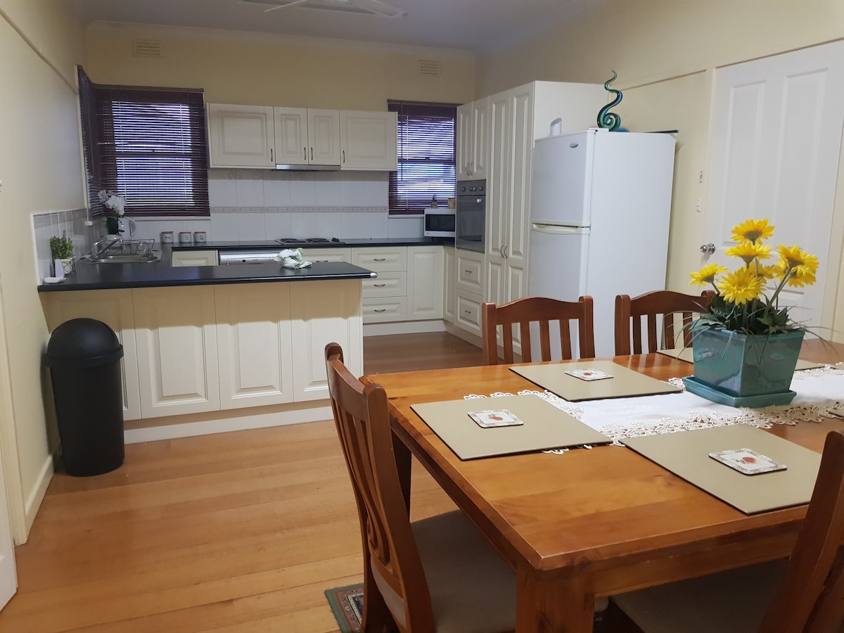 1 split system heating and air conditioning in the main living area Large kitchen with dishwasher, microwave pots pans etc. Fully kitted out for all your needs. 2 showers 2 toilets to accommodate larger groups. All linen and towels are new with spare towels for use at the stunning local pool or lake. Community hotel is a 2-minute walk along with IGA and all or lovely local shops. The rear yard is immaculate with a large selection of fruit trees for you to help yourself too.