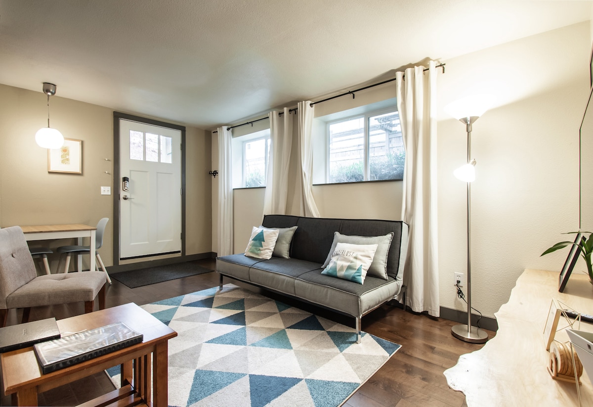 We have a compact but spacious-feeling 1 bedroom apartment that accommodates 4 guests with the addition of a full-size sleeper sofa in the living room. Open floor plan with the kitchen and living room. It offers a lot of windows and daylight with skylights in the kitchen and shower. We have a lovely west facing balcony that overlooks the the garden and provides territorial sunset views. It offers Northwest/Scandinavian modern design and a clean feel.