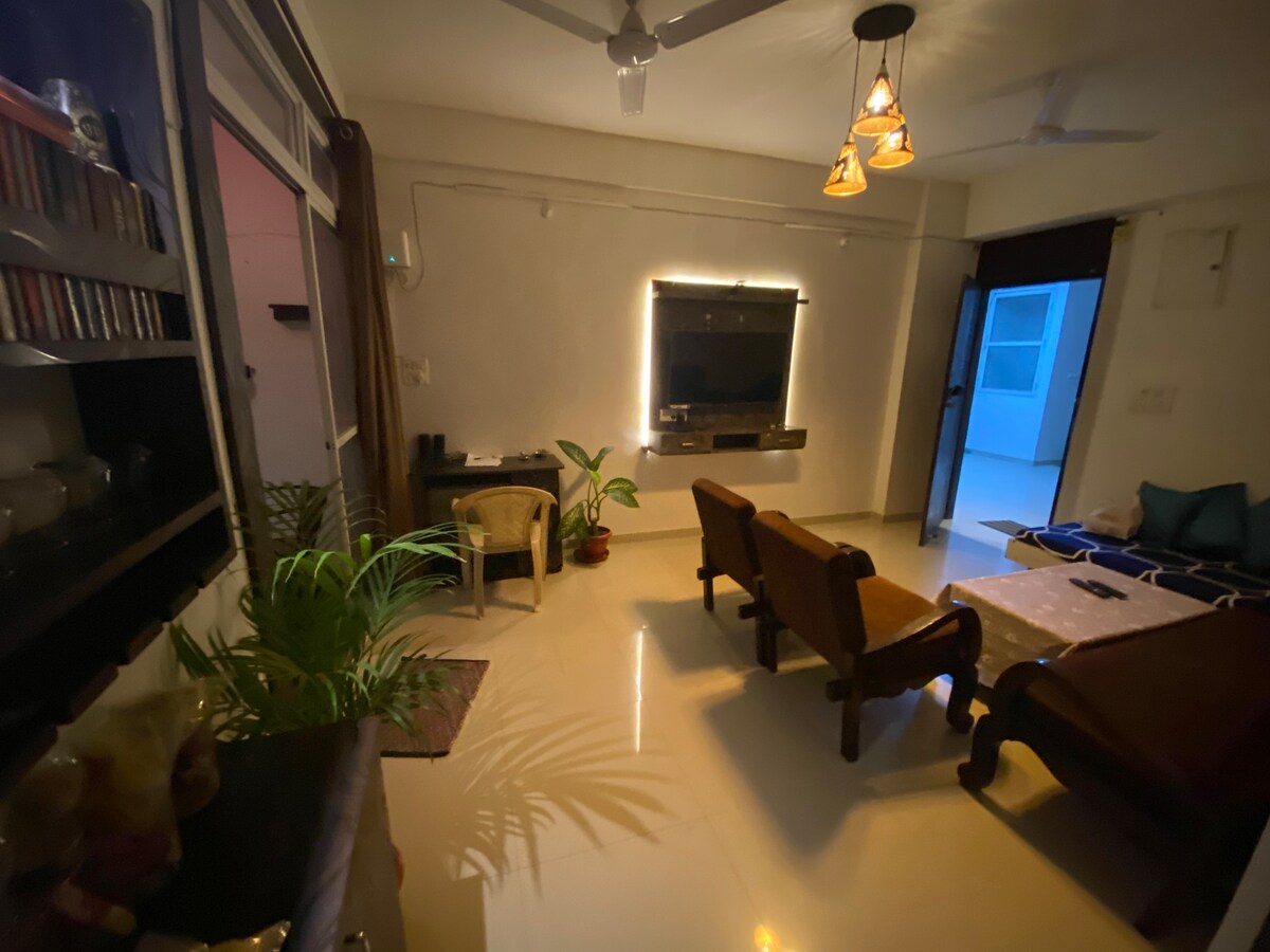 Eine gemütliche, unabhängige 2-Zimmer-Wohnung im obersten (9.) Stockwerk, die eine gemütliche Umgebung für deinen Aufenthalt bietet. Die Wohnung verfügt über 2 geräumige Schlafzimmer, die jeweils mit einer Klimaanlage ausgestattet sind, um deinen Komfort zu gewährleisten. Es gibt 2 saubere und gepflegte Badezimmer, die vor deinem Check-in gründlich gereinigt werden. Es steht eine voll funktionsfähige Küche zur Verfügung, in der du deine eigenen Mahlzeiten zubereiten kannst. Eine Waschmaschine steht auch zu deiner Verfügung. Genieße den Zugang zu 13 OTT-Plattformen, einschließlich Hotstar und SonyLIV