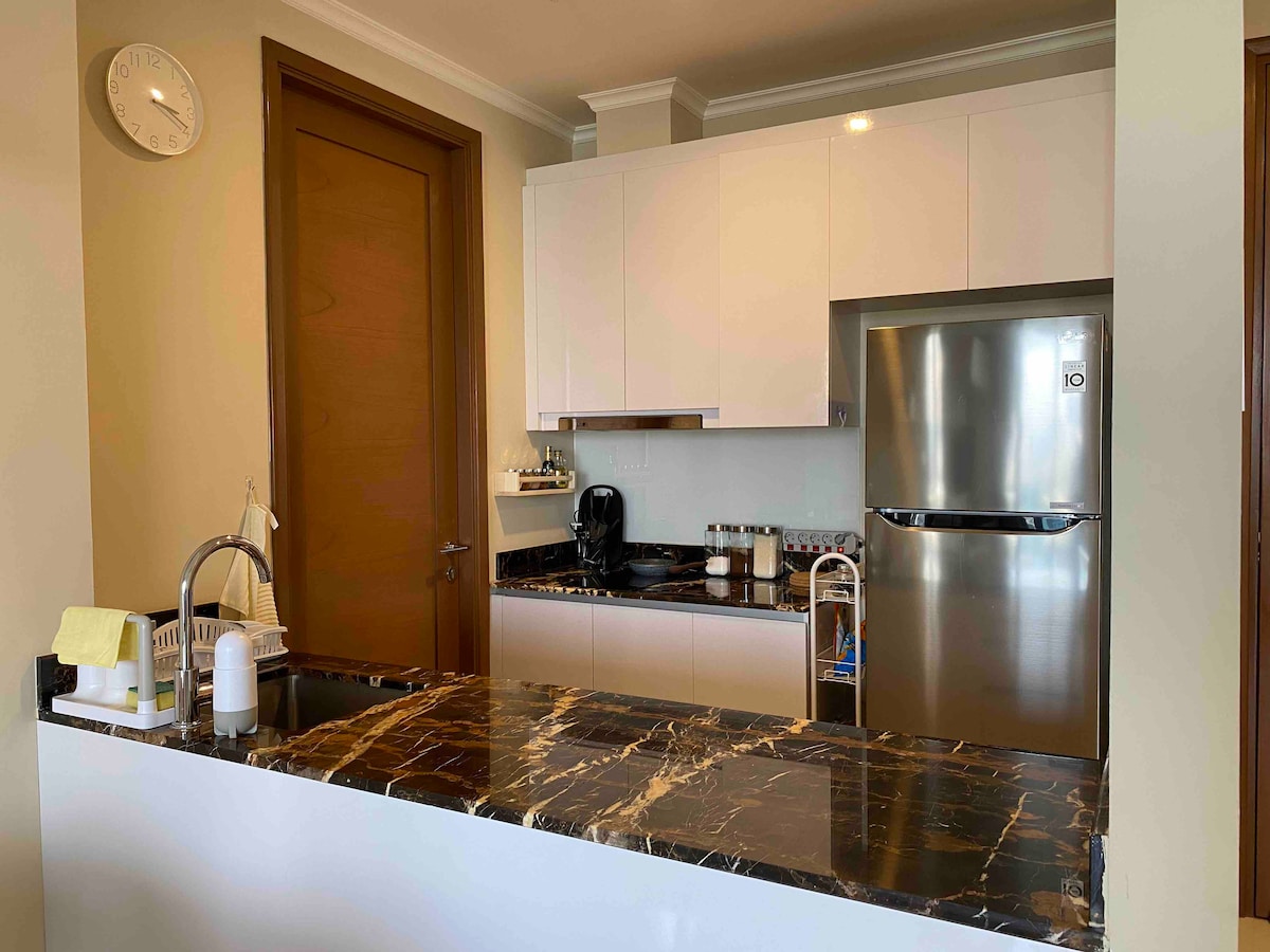 An elegant 24sqm studio in Jakarta's center, blending style and convenience. Includes kitchen, fast Wi-Fi, air-purification, 43" smart TV, sound system and Netflix. It is ideal for various stay types, with contactless access and amenities like pools, jacuzzi, gym, and basketball, Now features a Reverse Osmosis dispenser & food waste disposal, The picture shows a gas stove that has been replaced by an induction cooker (to follow the apartment guidelines for fire hazards)