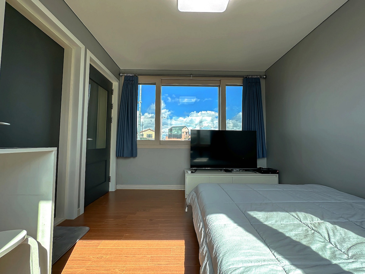 (Keine Waschmaschine im Zimmer, keine gemeinsame Waschmaschine. Bitte überprüfen Sie vor der Buchung.) Guten Tag. Dies ist Stay Hyeopjae 10-gil. Hyeopjae Beach ist etwa 10 Minuten zu Fuß entfernt! Die Bushaltestelle ist etwa 3 Minuten zu Fuß entfernt! Zimmer 2 (2. Stock) ist ein Studio Für 2 Personen, für Alleinreisende, Freundschaftsreisen! Es ist ein Ort, den ich Paaren empfehle. Es ist ein Ort, an dem Sie den schönen Sonnenuntergang und das Meer von Hyeopjae durch das Fenster nebenan sehen können, während Sie auf der Couch sitzen und fernsehen. Von der Terrasse aus können Sie auch das Meer sehen. Im Erdgeschoss befinden sich der Rasen, die Steinmauer von Jeju und eine Kanarienpalme, die seit etwa 35 Jahren still und leise dort steht! Mit Tastatur für die Türverriegelung, Video-Türsprechanlage und installierter Videoüberwachung können Sie sicher schlafen! In der Straße Stay Hyeopjae 10 Spüren Sie die einzigartige Sensibilität von Jeju Island und verbringen Sie einen angenehmen Tag.