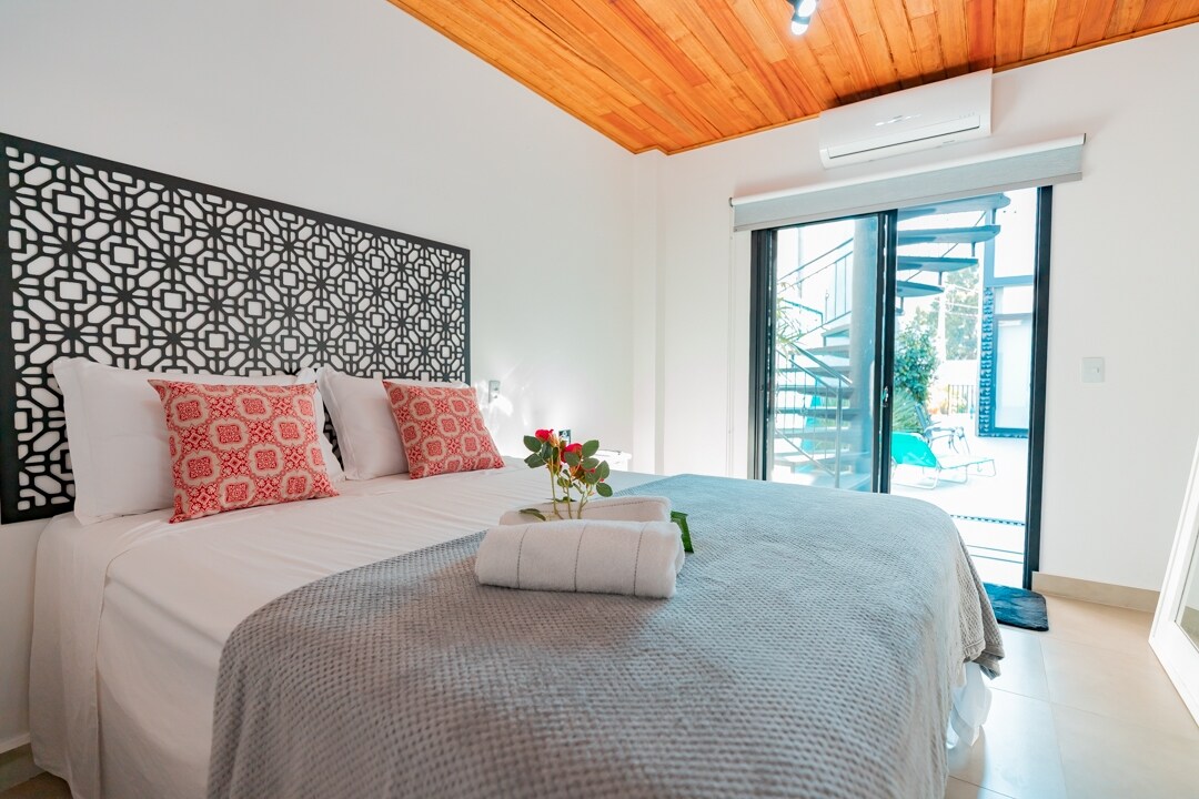 Suíte com cama de casal, ventilador de teto, televisão Smart, frigobar, banheiro e sacada com rede. Cozinha compartilhada com grande espaço para as refeições, fogueira, quiosque com churrasqueira ao lado da piscina e área verde. A apenas 400m da praia de Mariscal.