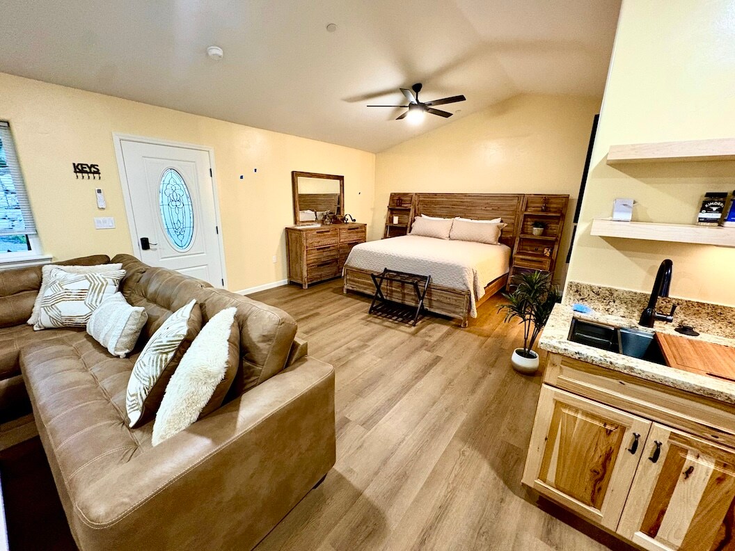Nothing more stunning than spring time rivers, a romantic, private & large guest studio w its own entrances, private terraces w towering ceilings, & King bed in historical craftsman on the South Fork of the Kaweah River in charming 3 Rivers,. Launch to Sequoia Natl. Park, Gen Sherman & Grant Grove, Kings Canyon Nat’l Park & Mineral King. Come enjoy the trees, trails, & beauty of a Natl’ treasure! Lake Kaweah, the foothill rivers and moments to town. Book your stay @ Crystal Cave far in advance!