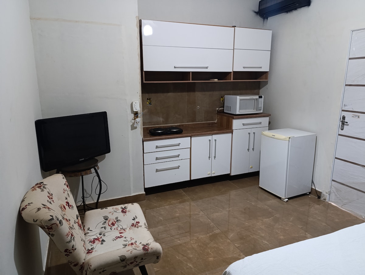Kitnet bem localizada em Serrana. Fica a apenas 17 km ( 14 minutos de carro ) do Novo shopping de Ribeirão. 25 minutos da AGRISHOW . Por ser uma rodovia de via dupla e não possuir pedagio, é uma otima opção de hospedagem pra quem quer curti Ribeirão Preto. Com ar condicionado, wifi, Cama, tv, frigobar. A kitnet é limpa, bem confortável e segura. A um quarteirão da Av Deolinda Rosa, próximo a supermercados, padarias, farmácias . Não possui garagem. Porém tem espaço para estacionar na rua !