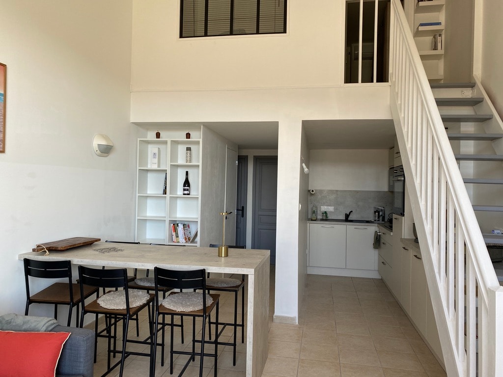 Appartement sur 2 niveaux situé dans l’ancien quartier Pisan de la Haute ville de Bonifacio. Un 1er escalier en pierre vous conduit à la pièce à vivre, cuisine équipée de lave vaisselle, lave linge et sèche linge. Un 2ème escalier en bois plus étroit, vous amène à la chambre avec petit dressing et salle de bain, wc, bidet, lavabos et petite baignoire sabot. La terrasse est dans le prolongement de la chambre avec une superbe vue sur la Sardaigne. Deux chaises longues, parasols, table et chaises.
