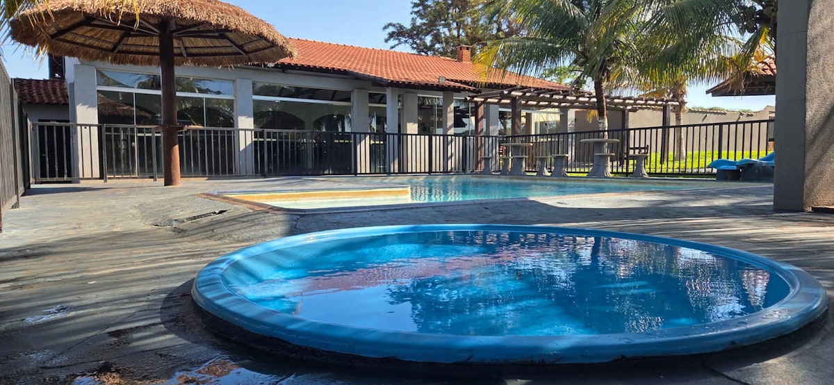 Espaço com piscina , mesas, cadeiras, freezer, geladeira, fogão, cozinha, wi-fi churrasqueira, balcão, 1 quarto com 4 camas de solteiro, sendo o outro uma suíte com tv, ar-condicionado . Espaço ideal para descansar e ter um lazer. Localizada em Sertãozinho/SP.
