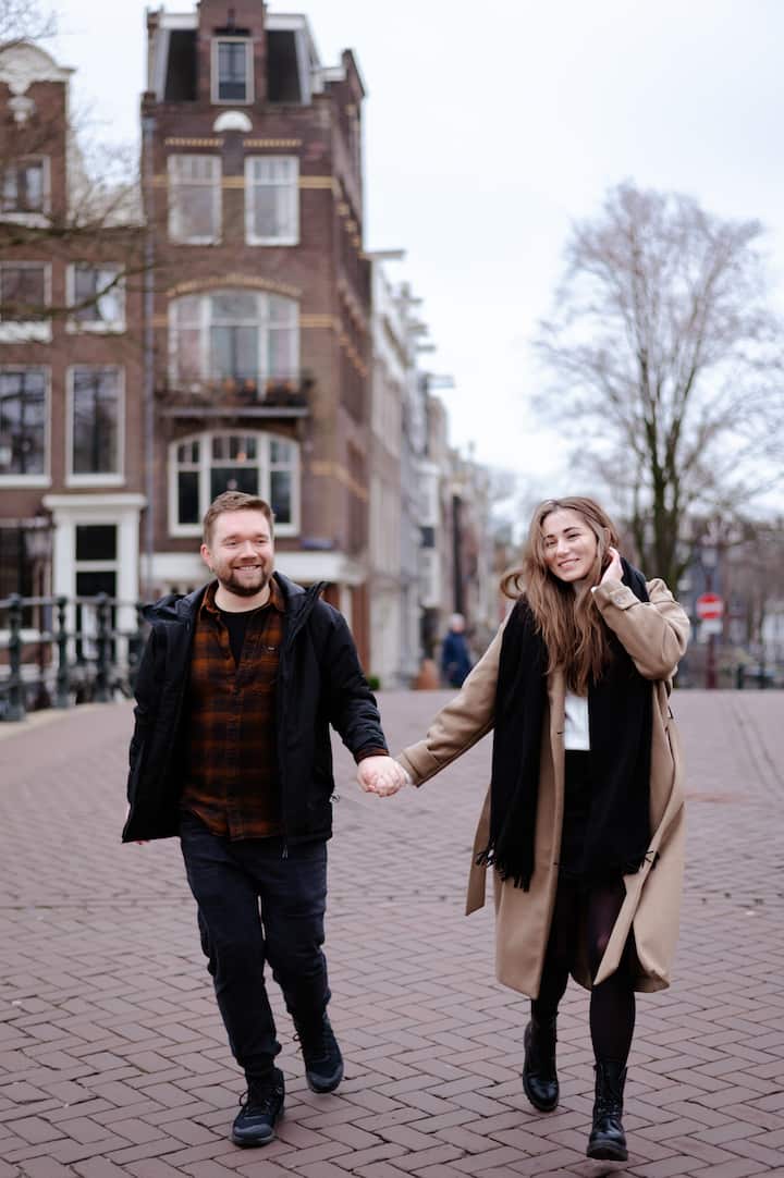 Feiere deine Liebe mit einem entspannten Fotoshooting für Paare im Herzen von Amsterdam. Wir beginnen am Damrak und machen uns auf den Weg durch malerische Kanäle, gemütliche Brücken und historische Straßen. Ich helfe euch, euch gemeinsam wohlzufühlen, damit wir aufrichtige, intime Momente einfangen können, nur ihr beide, die die Gegenwart des anderen genießt, während ich zeitlose Porträts erstelle, die von der schönen Architektur der Stadt umrahmt werden.