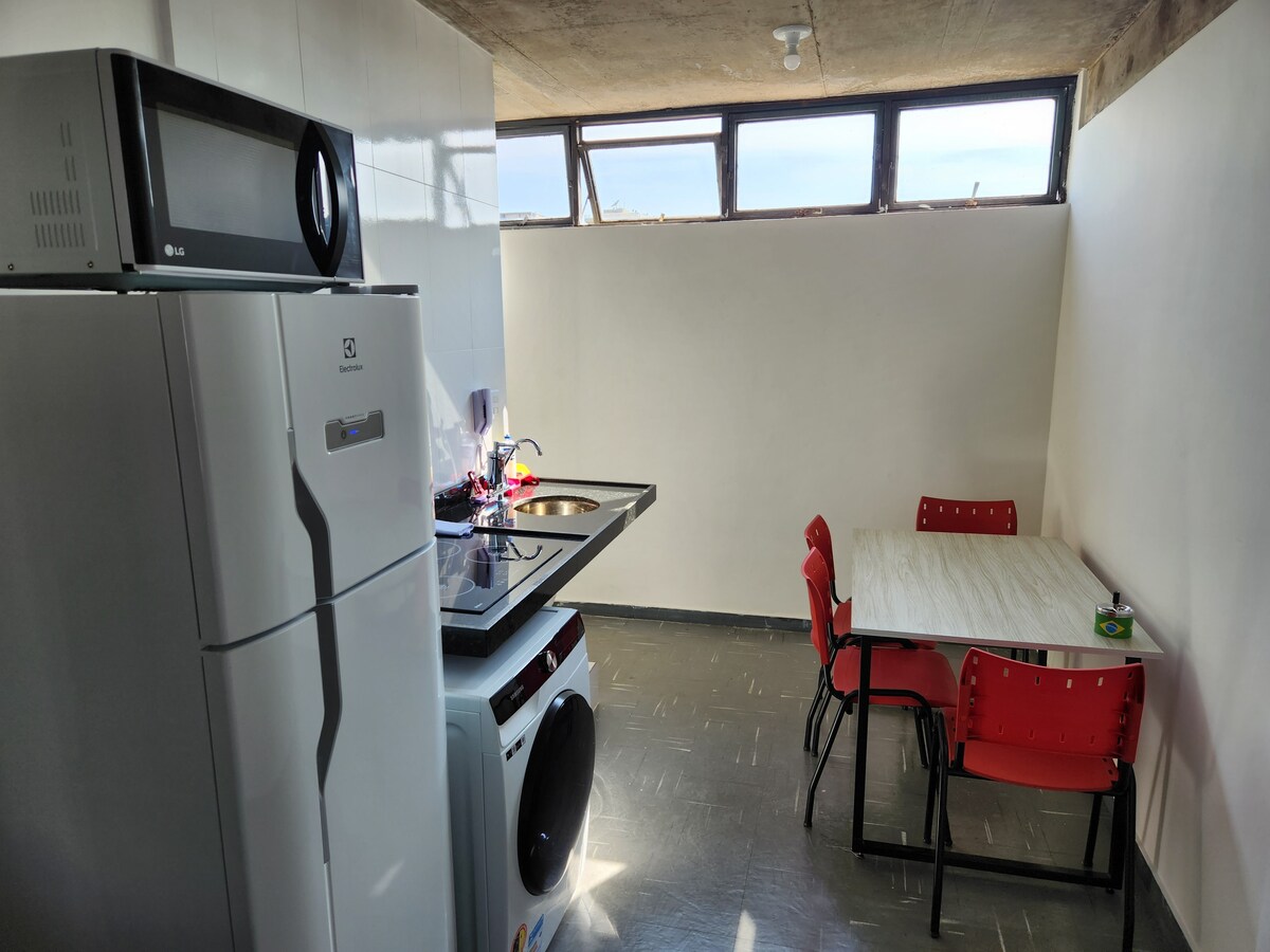 Dachgeschoss eines Zimmers im Zentrum. Klimaanlage im Schlafzimmer. Deckenventilator im Schlafzimmer und Wohnzimmer. Offener Bereich des Dachgeschosses zur ausschließlichen Nutzung. Voll ausgestattete Küche. Waschmaschine und Trockner, Smartv. Betten können für Paare oder Einzelpersonen konfiguriert werden. In der Innenstadt von Sete Lagoas, in der Nähe des Paulino-Sees (Hauptsee der Stadt) Sehr familiäres Gebäude, vierter Stock mit Aufzug. Es gibt einen Parkplatz, der nach vorheriger Absprache zur Verfügung gestellt wird. Wir haben eine weitere Wohnung im selben Gebäude.