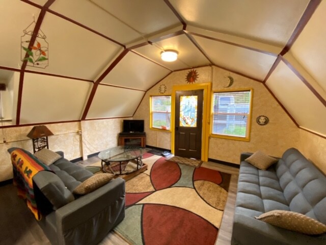 Experience the Alaska lifestyle in our cozy, ON-grid yurt. Nestled a short walk up the hillside, you'll be serenaded by squirrels and can watch the trees rustling overhead from your new firm memory foam bed. Far from "roughing it", this yurt has all the amenities: hot and cold running (drinkable) water, electricity, a full kitchen and a shower. While there is a composting toilet inside the yurt, if you'd like to stick to a "normal" toilet, there is also a shared restroom near the parking area.