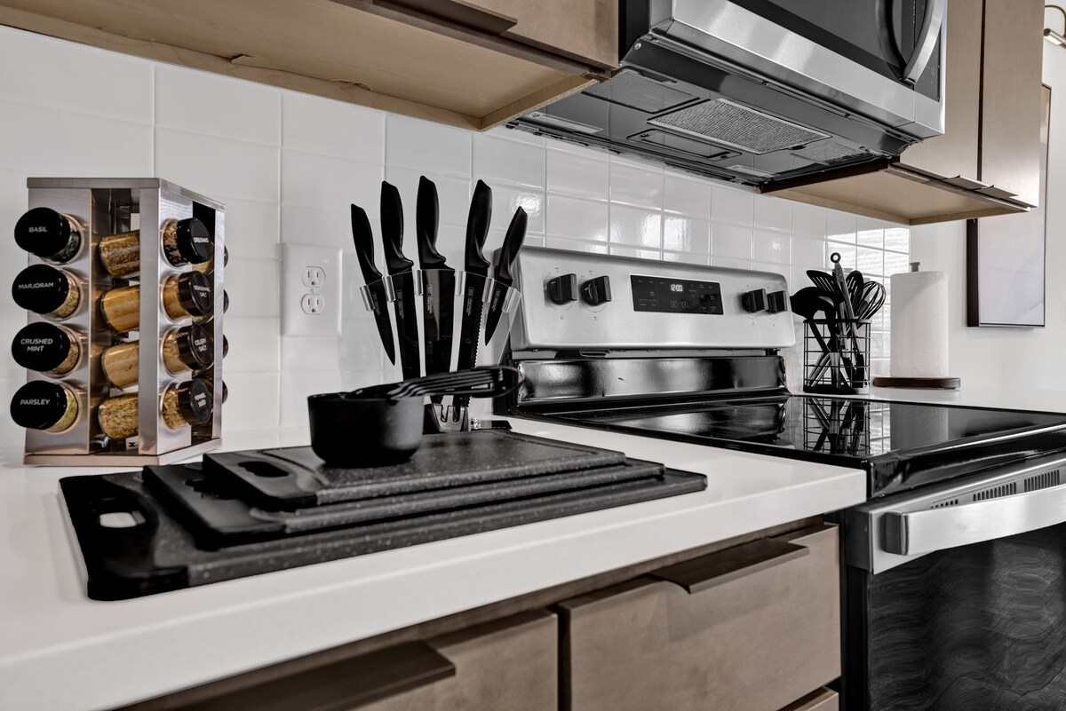 Genieße modernen Komfort in dieser stilvollen Wohnung mit 1 Schlafzimmer und 1 Badezimmer, zwei 60-Zoll-Flachbildfernsehern, einem weichen Kingsize-Bett und einer luxuriösen Glasdusche. Bleiben Sie mit einer Waschmaschine/Trockner in der Unterkunft frisch und beginnen Sie Ihren Tag an der kostenlosen Kaffee- und Teebar. Die Kücheninsel mit Barhockern ist perfekt zum Essen oder Arbeiten. Dieser Raum ist sowohl für Entspannung als auch für Komfort konzipiert und ist der perfekte Rückzugsort für jeden Reisenden.