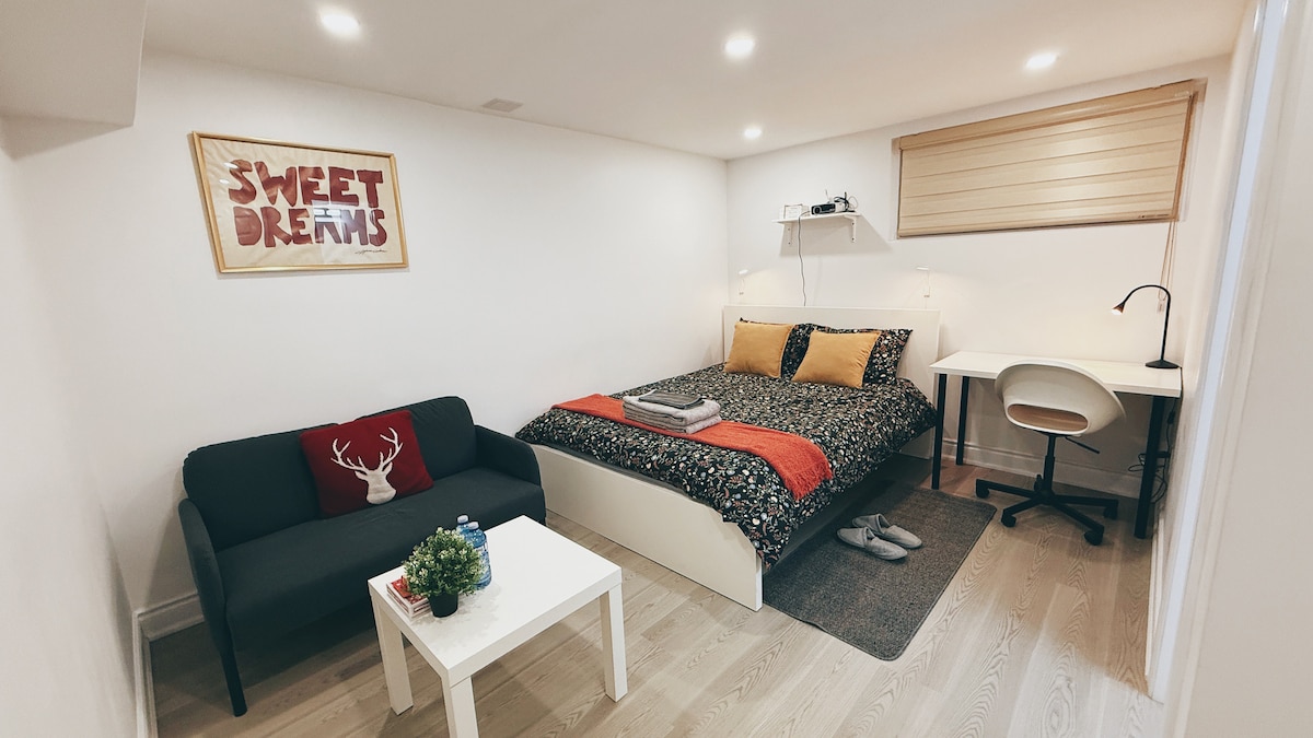 Entspanne dich in dieser ruhigen Kellerwohnung, du wirst dich sofort nach dem Betreten wie zu Hause fühlen! Enthält einen privaten separaten Eingang zur Suite, komplett mit einem Schlafzimmer mit einem bequemen Queensize-Bett, einem privaten Waschraum, einer voll ausgestatteten Küche mit kostenlosem Kaffee, Tee und Snacks sowie einem Wohnzimmer mit einem Schlafsofa, einem TV und einem persönlichen Büroraum. Außerdem steht ein kostenloser Parkplatz zur Verfügung. Diese charmante Unterkunft ist perfekt für Geschäftsreisende, internationale Studenten, junge Berufstätige und Paare.