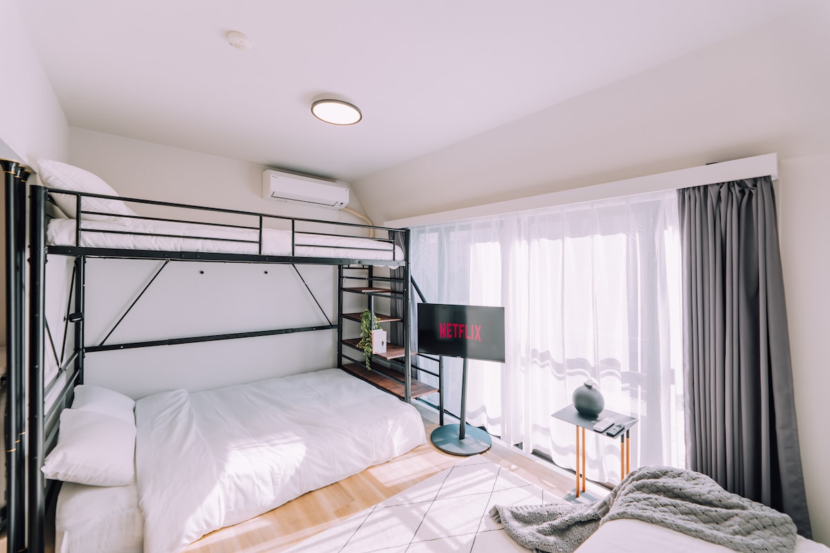 Es ist praktisch für die ganze Familie, an diesem zentral gelegenen Ort überall hinzufahren. Zwei Kingsize-Betten im Zimmer, geeignet für Familie und Freunde Der Boden ist bequem und der Raum ist privat.Geeignet für bis 5 Personen. Die offene Küche ist komplett mit Induktionsherd, Töpfen und Geschirr ausgestattet, wenn du hausgemachte Mahlzeiten essen möchtest, ist einfaches japanisches Kochen kein Problem Die Bar ist mit dem Wohn- und Essbereich verbunden, egal ob es sich um einen morgendlichen Kaffee oder ein Abendessen handelt, alles ist genau richtig. Das Waschbecken ist mit einem separaten Badezimmer ausgestattet, sodass du mit ein paar Leuten in deinem eigenen Tempo bleiben kannst Mit Bluetooth-Stereoanlage Musik zu hören und nachts in Japan ein heißes Bad zu nehmen, ist der entspannendste Moment der Reise. Es gibt einen Projektor im Raum, sodass Sie die häufig verwendete digitale Streaming-Plattform einfach anschließen können Waschmaschine, Luftreiniger, Bügeleisen und geräumiger Kleiderschrank, alles, was du brauchst, ist bereit Der Raum ist genau das Richtige für eine Person, um ruhig an der Bar zu arbeiten oder ein paar Tage mit Freunden oder der Familie zu verbringen Seien Sie zu Hause, jeder bequem.