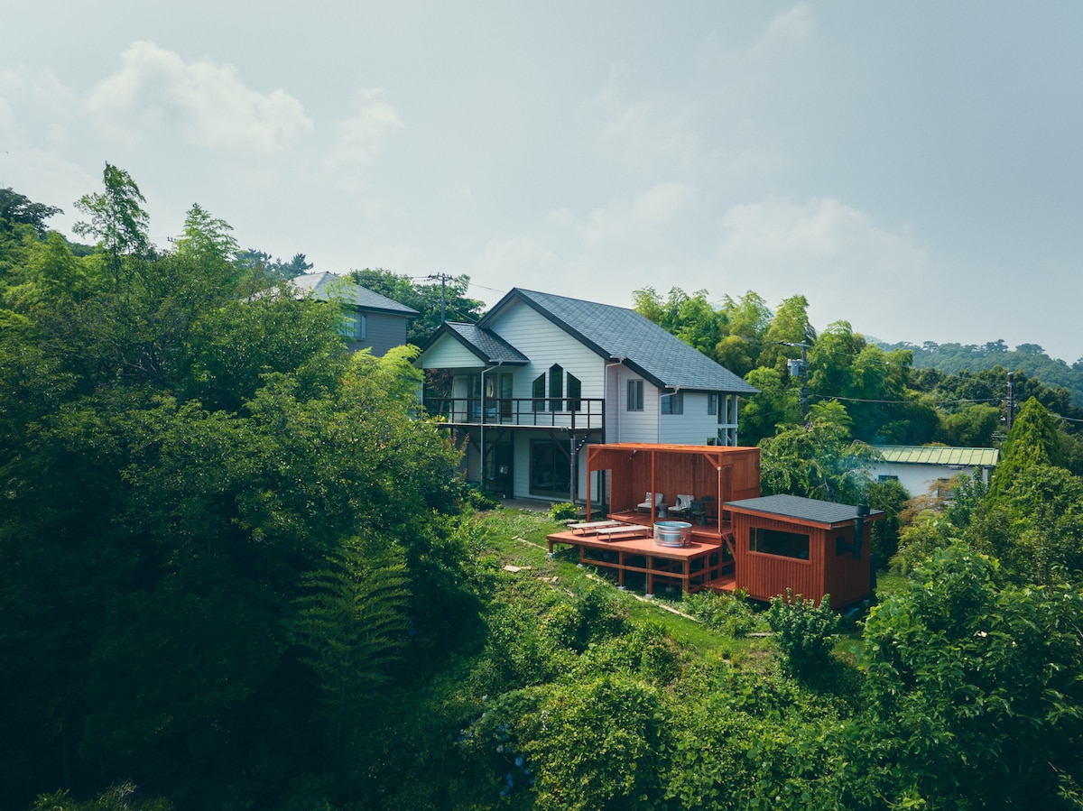 3 Minuten mit Bus/Grill, Lagerfeuer, natürliche heiße Quelle, Sauna, Wasserbad, Heimkino/Grill und Lagerfeuer bei Regenwetter
