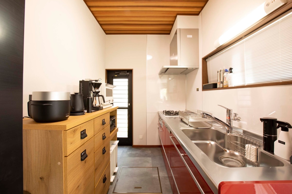 „TAKUMI‗AN“ ist ein historisches Anwesen aus einer vergangenen Ära in der Gegend von Toda/Sawakai, umgeben von einem Fischerhafen, von Kirschblüten bedeckten Bergen und Zitrusplantagen. Es wurde als modernes Gartenhaus mit Holzrahmen in einer unberührten natürlichen Umgebung neu geboren.Dies ist die Quintessenz des „japanischen Lebensstils“, bei dem Sie den reichen, fließenden Rhythmus des Lebens einatmen können. [Ruhe am Morgen und eine Küche, in der man die Jahreszeit genießen kann] Die neu gebaute Gartenküche ist ein besonderer Ort, um ein elegantes Frühstück inmitten des Grüns der Berge zu genießen.Brühen Sie handgemahlenen Kaffee und spüren Sie die saisonale Brise.Eine so höfliche morgendliche Geste weckt ein Gefühl des Alltags, das in Vergessenheit geraten ist. [Private Bar am Abend mit Kamin] Wenn die Sonne untergeht, verwandelt sich die Holzterrasse in eine private Bar nur für dich.Sprechen Sie mit Ihren Liebsten, während im Hintergrund das Knistern des Feuers zu hören ist.In der Stille, abgeschnitten von der Außenwelt, wird die Nacht immer tiefer. [Die Freude am Entdecken und der Komfort des Wohnens] Wenn du zum Kap spazierst, bietet sich dir ein spektakulärer Blick auf den Mt. Fuji, der im Meer zu schweben scheint.Entdecken Sie diese Aussicht auf eigene Faust und genießen Sie die Freude, in das Leben der Hafenstadt einzutauchen.Ausgestattet mit einer voll ausgestatteten Küche, einem Gastrockentrockner und Highspeed-WLAN versprechen wir den Komfort eines längeren Aufenthalts. Entdecken Sie hier den zeitlosen Rhythmus des japanischen Lebens neu.