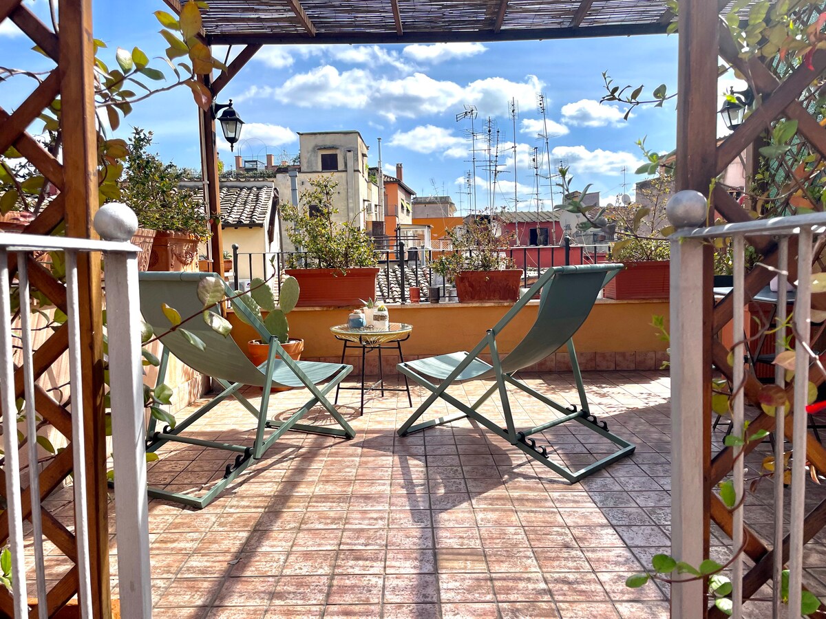 Helle und ruhige Penthouse-Wohnung im Herzen von Trastevere, mit einer wunderbaren Terrasse und einem unvergleichlichen Blick auf die charmanten römischen Dächer und den Gianicolo-Hügel. Die Wohnung ist sorgfältig renoviert und befindet sich in einer malerischen Kopfsteinpflasterstraße, gleich um die Ecke von den lebhaften Restaurants und Cafés. La Casetta al Mattonato befindet sich im 3. Stock (41 Stufen, kein Aufzug) eines typisch römischen Gebäudes aus dem 17. Jahrhundert, nur wenige Gehminuten von allen wichtigen Sehenswürdigkeiten entfernt.