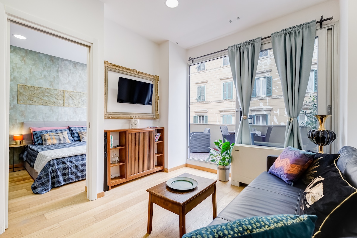 Diese Einzimmerwohnung befindet sich in einem historischen Gebäude mit Blick auf einen der berühmtesten Plätze der Welt. Sie liegt im ersten Stock und verfügt über moderne Annehmlichkeiten und eine beneidenswerte Terrasse, die sich perfekt für Abendessen im Freien eignet. Ideal für Paare oder kleine Familien, verfügt die Wohnung über eine erstklassige Klimaanlage in allen Zimmern, ein drahtloses Soundsystem für mehrere Räume, ein Dampfbad sowie eine Badewanne. Tritt vor die Haustür, wirf deine Münze ein und tauche in die lebendige Atmosphäre des Stadtzentrums ein.