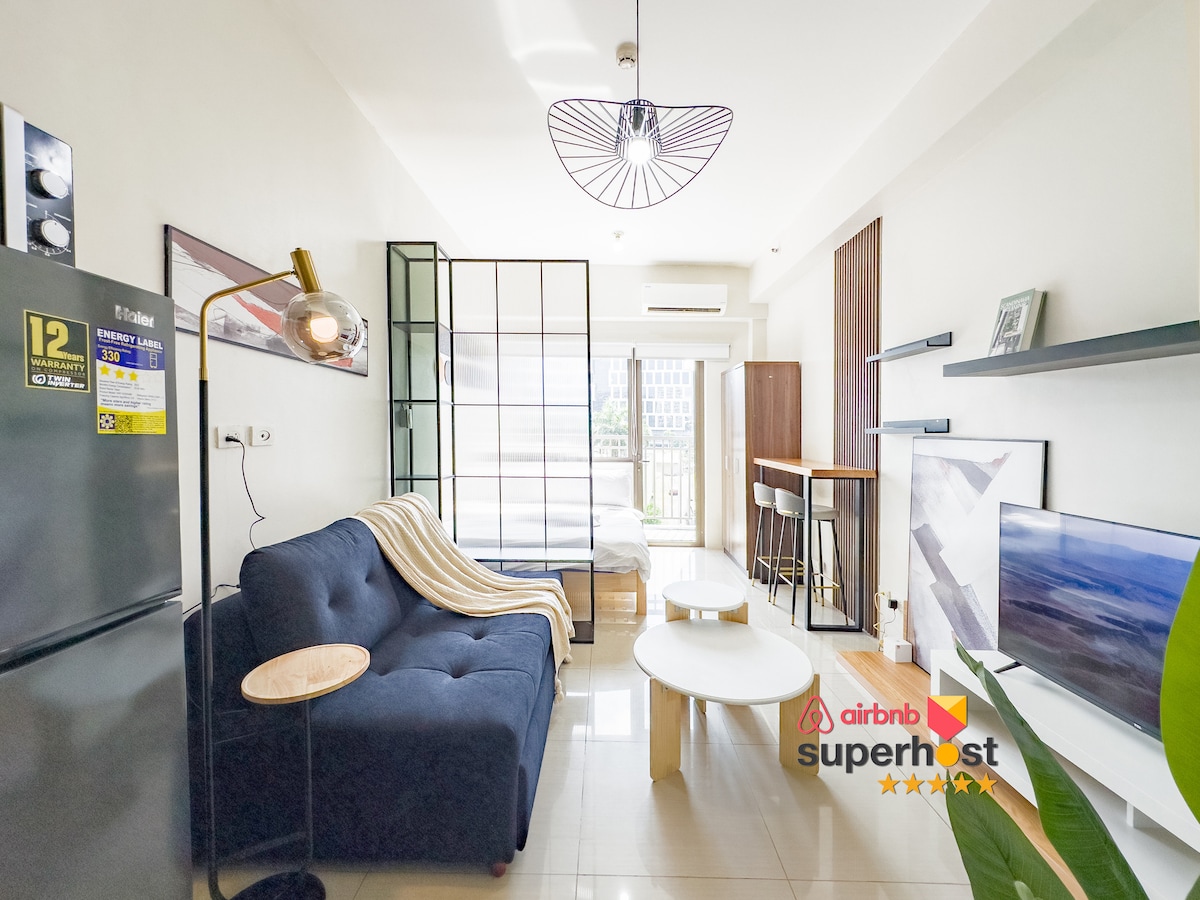 Willkommen in unserer minimalistisch gestalteten 1-Zimmer-Wohnung mit herrlichem Poolblick. Entspanne dich im luftigen Wohnbereich mit unserem Smart-TV, koche deine Mahlzeiten in unserer voll ausgestatteten Küche zum Essen oder genieße einfach Momente auf dem Balkon. Aber das Wichtigste ist, schlafe ruhig in unseren komfortablen Betten. Nur wenige Gehminuten von Ikea, dem SMX Convention Center, der MOA Arena und den umliegenden Einkaufsmöglichkeiten der Mall of Asia entfernt. Gönne dir die nahegelegenen Restaurants, Cafés und praktischen Geschäfte direkt vor der Wohnung.