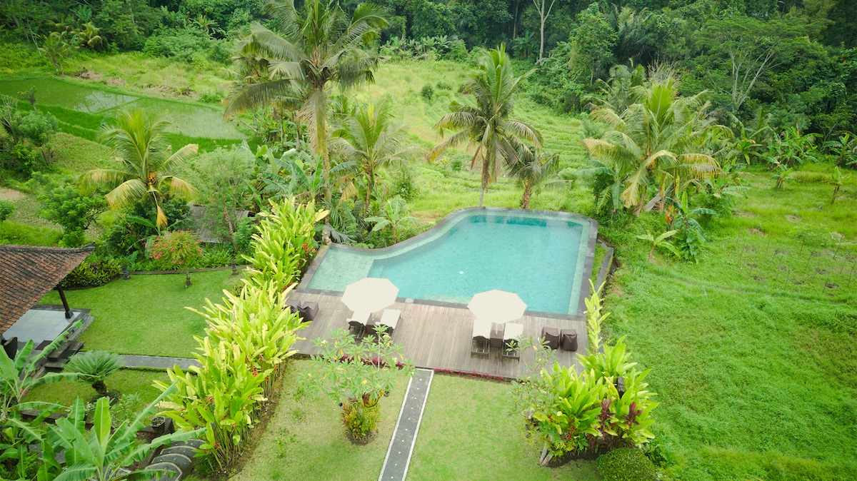 Escape to your own private jungle villa with pool, a secluded sanctuary where luxury meets nature. The Love Ashram is a romantic retreat for deep relaxation & connection. Surrounded by lush greenery, enjoy privacy, jungle views, & a peaceful atmosphere-ideal for couples, honeymoons, & nature lovers seeking a serene escape in Ubud. As part of the living landscape, the rice fields surrounding the villa move through natural cycles—seeded, growing, & harvested—so views may vary throughout the year.