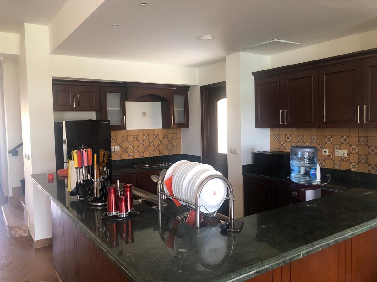 Entfliehe unserem ruhigen Chalet an der Nordküste, perfekt neben dem Marassi Compound und Marassi's Aquapark. Bequemlichkeit ist der Schlüssel zu Geldautomaten und Supermärkten, die 5 Minuten vom Tor entfernt sind. Nur 2 Minuten zu Fuß zum sonnenverwöhnten Strand, der von deiner Terrasse aus sichtbar ist. Das Chalet bietet drei komfortable Schlafzimmer, zwei mit Klimaanlage und eines mit Ventilator. Genieße kostenlosen Strandzugang und kostenlose Sonnenschirme für deinen Aufenthalt. Es gibt auch kostenlose Parkplätze.