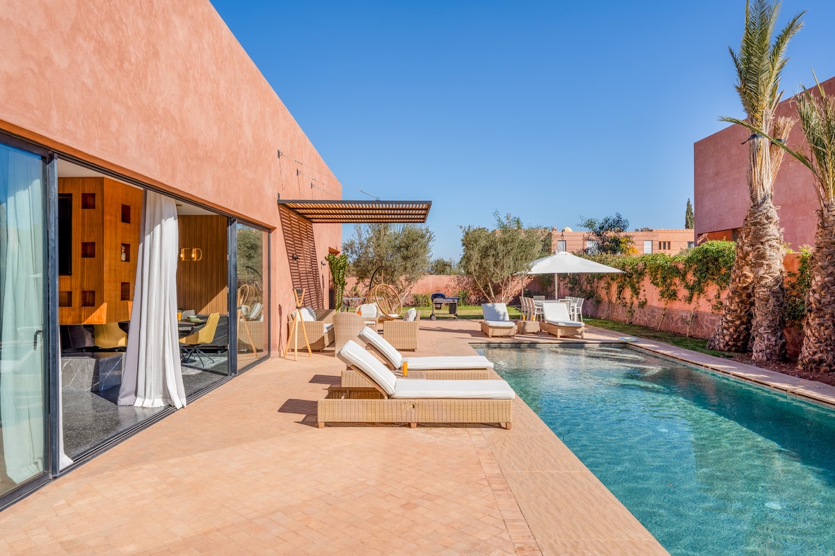✨Villa Inès: Eleganz pur✨ 💎 Täglich GRATIS Frühstück serviert! 🏊 Beheizter Pool (7x4m) im schönen Garten. 🏸 Volleyball, Badminton & Tischtennis. 🏡 24/7 Gesicherte Anlage, 15 Min zum Zentrum & 5 Min zum Golf. 👩🍳 Haushälterin & Privatkoch für maßgeschneiderte Menüs. 🛏 4 Luxus King-Suiten, TVs mit Netflix, IPTV. 🚿 Inloop-Duschen, feine Bettwäsche & Haartrockner. 👶 Komplettes Baby-Set (Bett, Buggy, Hochstuhl). ✨Die Kunst zu leben in Marrakesch.✨Schreib uns eine Nachricht!