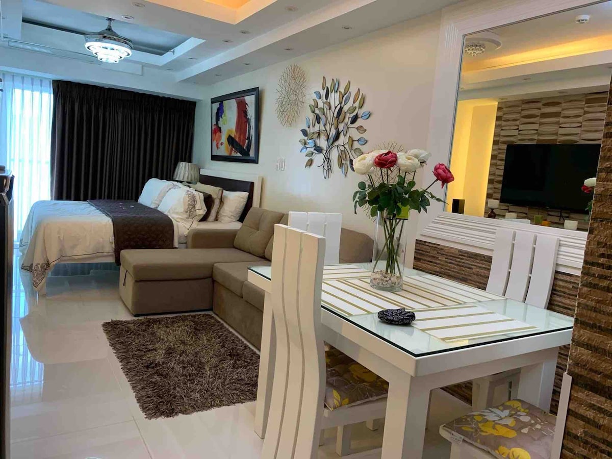 Brand new studio equipped with king and pull-out queen beds perfect for a family of 4. Located on the 3rd floor of the newest Swiss condominium of Crosswinds Luxury Resorts, the Grand Quartier 3, this corner unit of 48 square meters boasts of breathtaking views from its outdoor balcony. Complete with kitchen equipment and utensils, guests may enjoy the flavors of home cooking in the perfect home away from home. The room is highly sterilized using UV lights to ensure safety.
