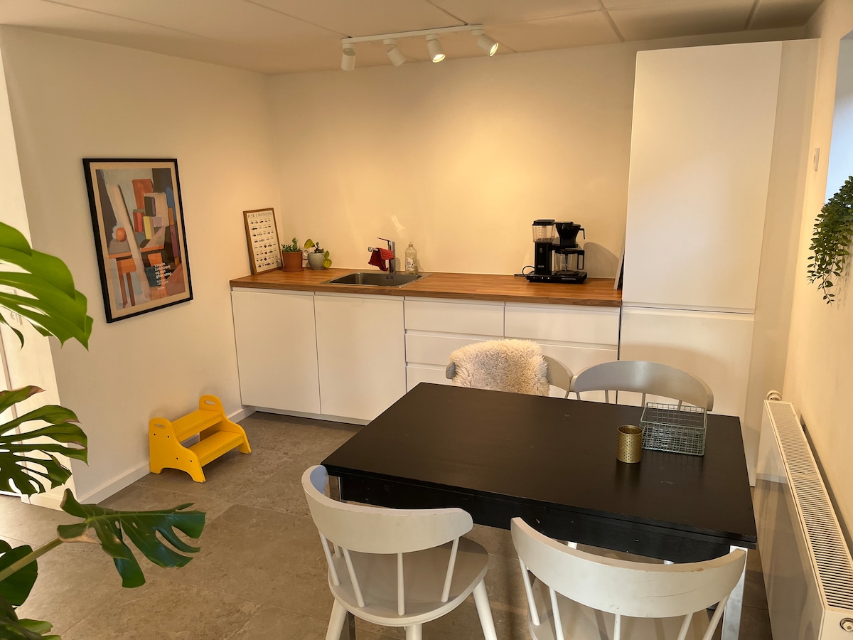 Weniger als 5 Gehminuten vom Wald, vom See, vom Stadtzentrum und vom Bahnhof entfernt. Und eine 5-minütige Fahrt vom Highway entfernt: Unser gemütlicher Anbau befindet sich im zentralen „Sydbyen“ in Silkeborg - dem alten Arbeiterviertel der Stadt. Hier sind Sie nah an allem und doch in einem ruhigen Juwel untergebracht. Du kannst den Garten, den Innenhof und die eigene überdachte Terrasse des Anbaus nutzen. Es gibt kostenlose Parkplätze auf dem Grundstück, die Möglichkeit, ein Elektroauto aufzuladen, und wenn du „von zu Hause aus“ arbeiten möchtest, gibt es sowohl WLAN als auch LAN im Nebengebäude.