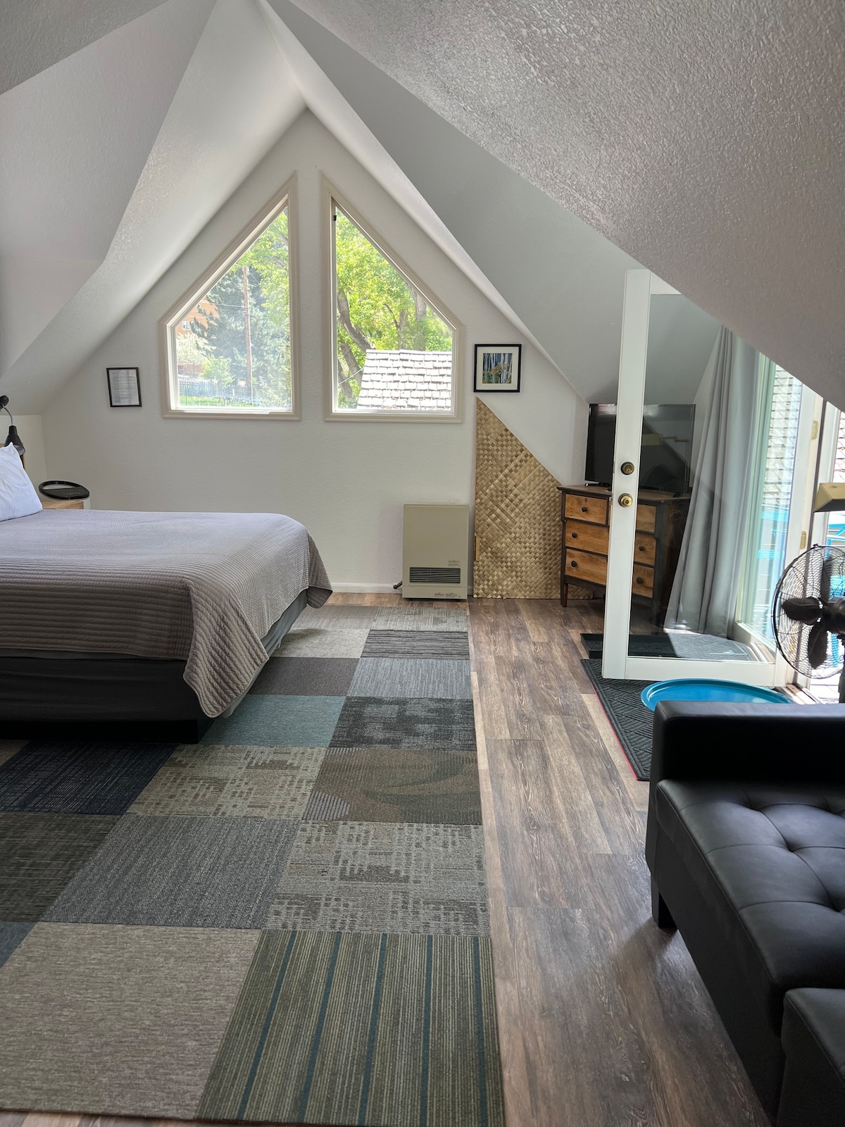 Neue Parkettböden, Betten, Beleuchtung und Möbel. Großes Zimmer im King-Hotel-Stil mit eigenem Balkon mit Sitzgelegenheiten. Genieße deinen Morgenkaffee auf deinem Balkon mit Blick auf den Hof und die Espen sowie den majestätischen Blick auf die Berge rundherum. Dieses große Zimmer im Hotelstil ist privat und geräumig. Es verfügt über ein Kingsize-Bett, eine Ledercouch und ein eigenes Bad. Kaffeekanne, Kühlschrank und Mikrowelle auf dem Zimmer. Wie ein Hotelzimmer, aber ohne das große Hotel. Neues Glasfaser-Internet!