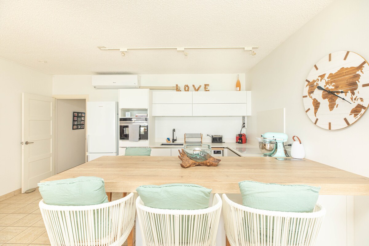 Moderne Luxus-Wohnung mit 1 Schlafzimmer, vom Haupthaus getrennt. Notstromgenerator. Durchgehend Marmorböden. Alle Edelstahlgeräte in einer voll ausgestatteten Küche. Kostenloses WLAN im Inneren und auf der Dachterrasse. Satelliten-TV. Zusätzliches Queensize-Schlafsofa im Wohnzimmer für 2 Personen. Waschmaschine/Trockner. 90 Schritte zum schönen Simpson Bay Beach. Private Dachterrasse mit 360°-Blick. Grill, Kühlschrank und Spüle auf der Terrasse. Liegestühle, Strandtücher, Sonnenschirm, Kühlboxen. Parkplatz direkt vor deinem Tor. Massage vor Ort verfügbar