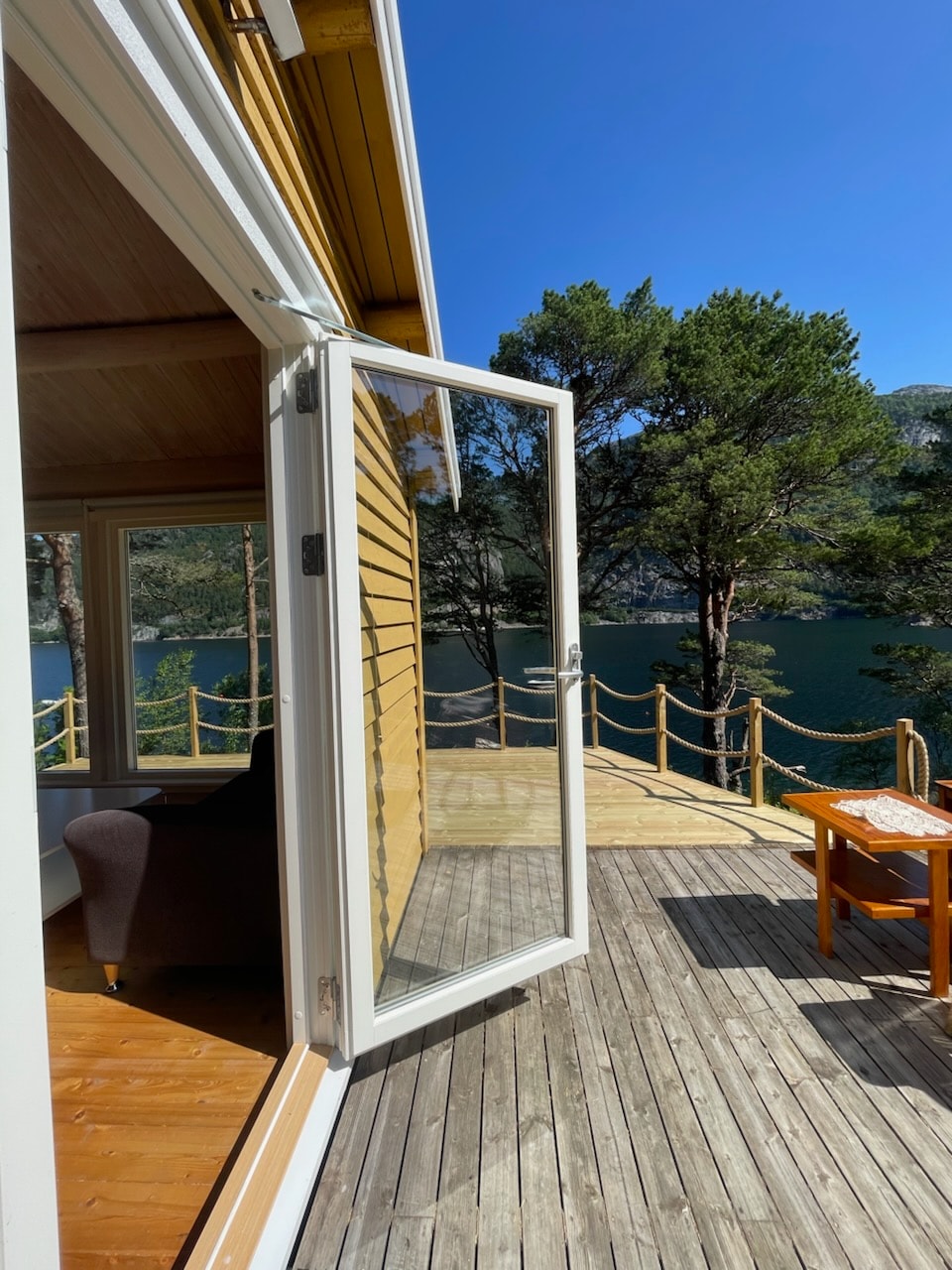 Moderne hytte ved sjøen med havutsikt og båtleie